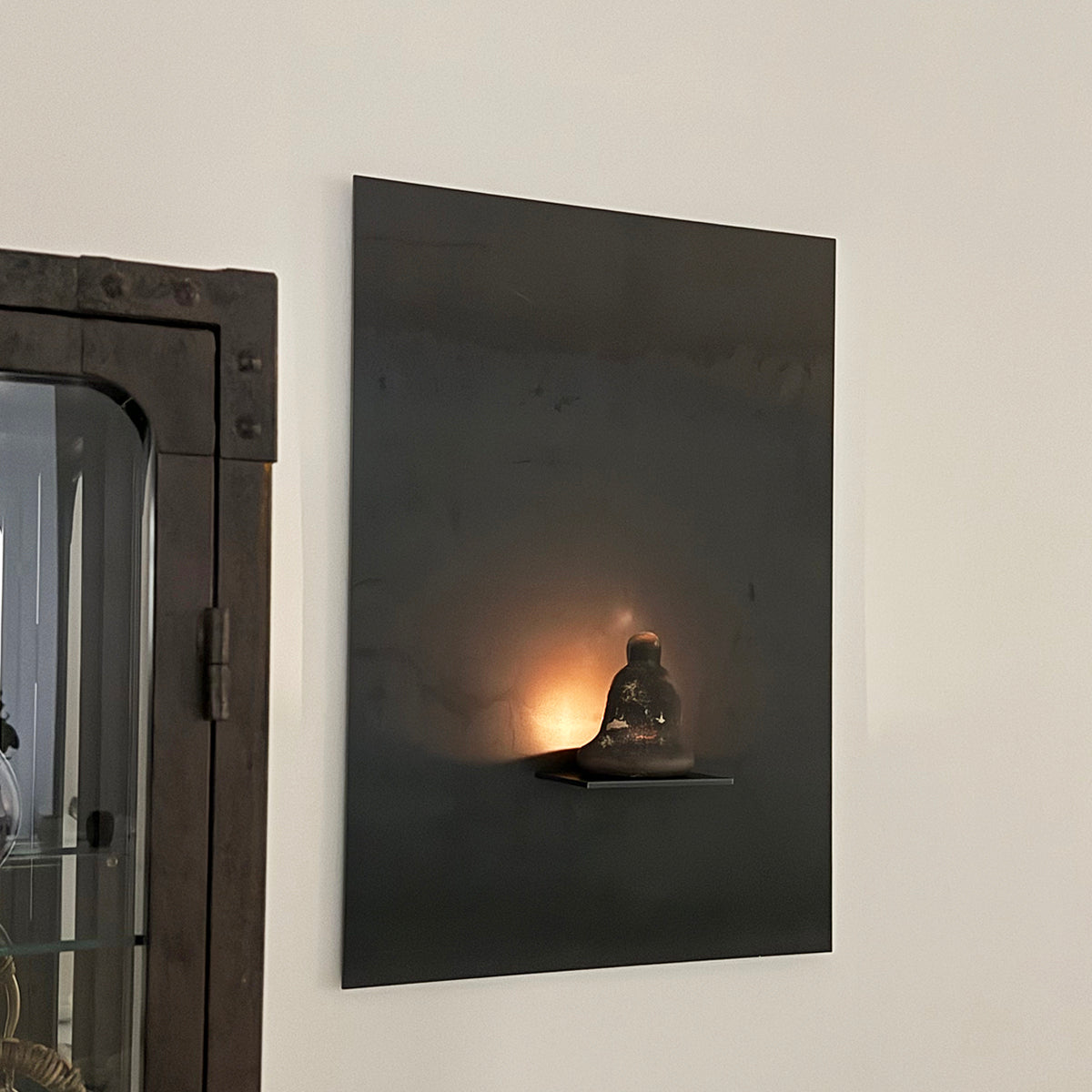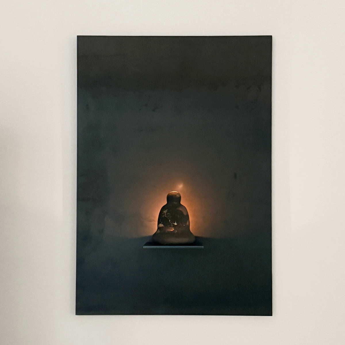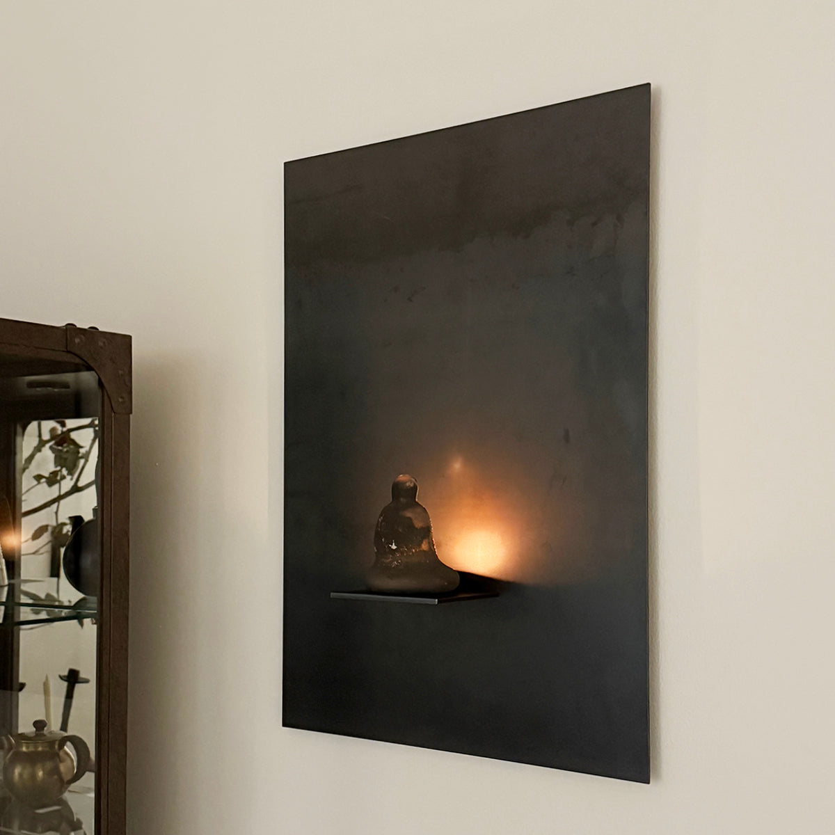 A tasteful artwork of the silhouette of the Bodhidharma in black glazed glass lined in gold leaf with a large iron frame to be wall-mounted.