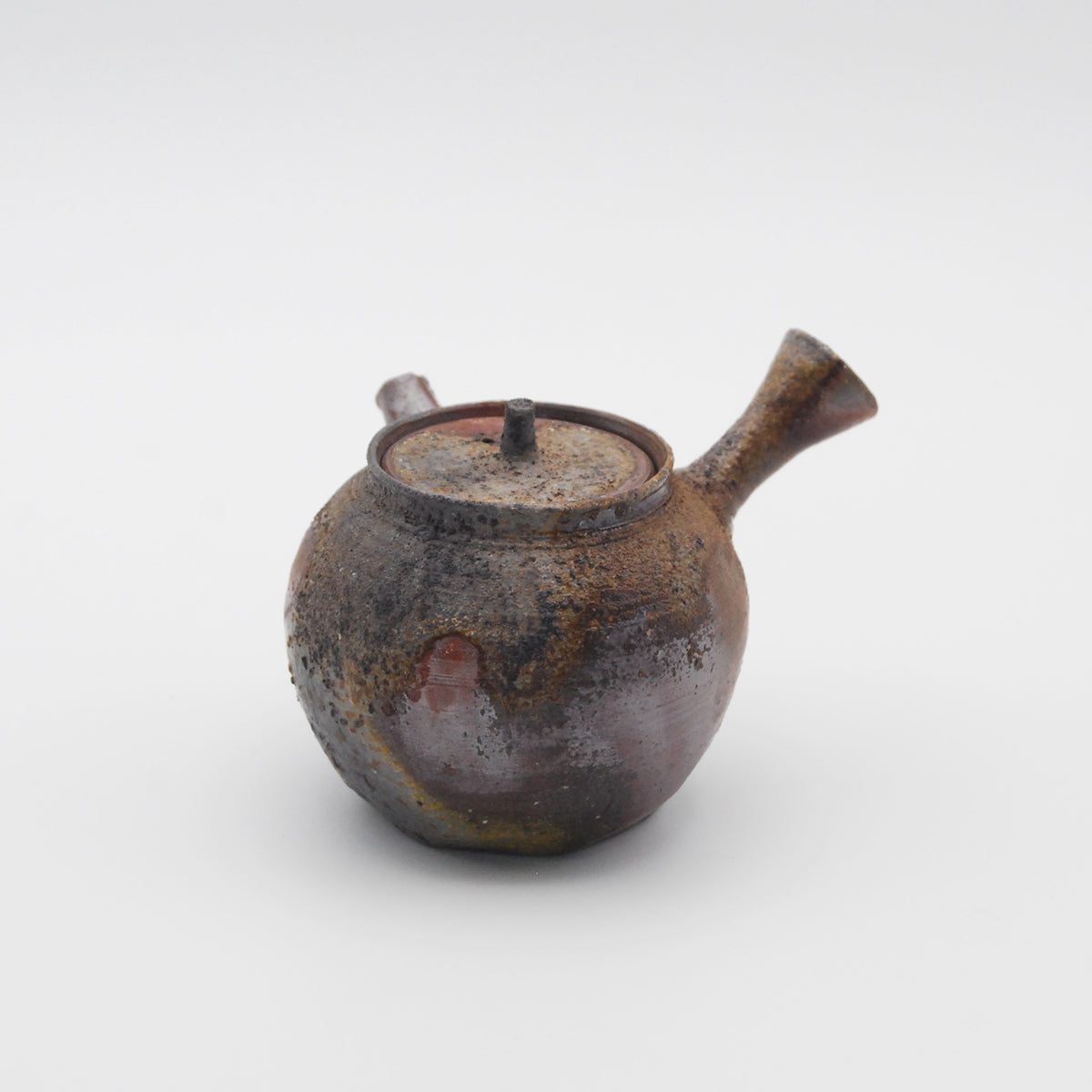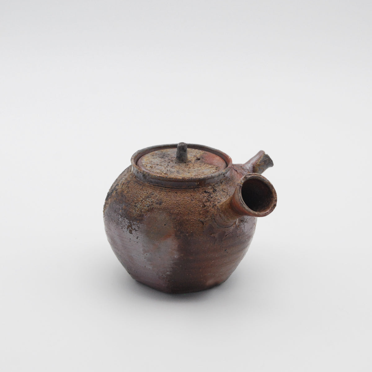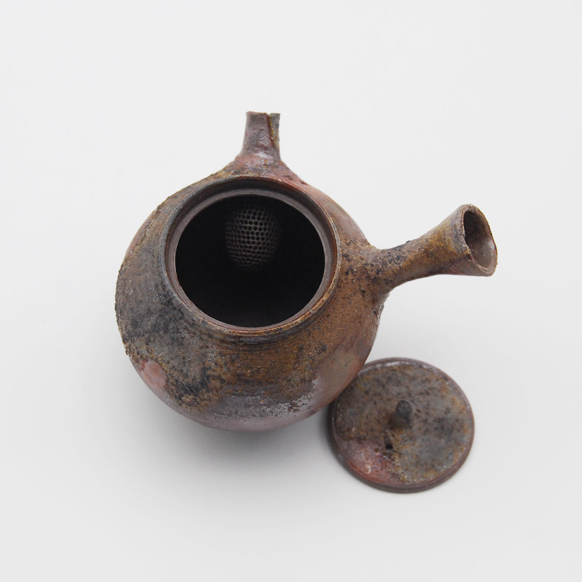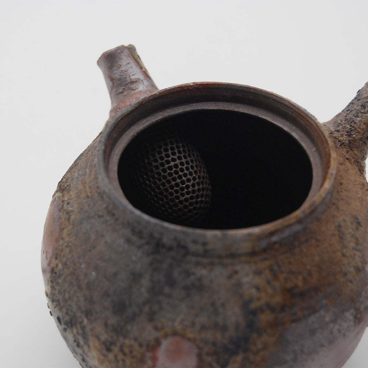 This exceptional Bizen teapot is a masterpiece that encapsulates the region's characteristic clay-making and specialized firing techniques. Its visual appearance is distinctly Bizen; however, its shape surpasses any other teapot crafted there. Each teapot is remarkably lightweight, weighing only 300 grams, and is equipped with a handcrafted strainer featuring 400 to 600 holes. The strainer is seamlessly integrated into the body's opening, ensuring an unobstructed flow that enhances the overall brewing experience. Every piece is unique, displaying melted ash textures, hidasuki rope markings, and red and black scorch marks. Every perspective reveals intricate details to be appreciated over time.