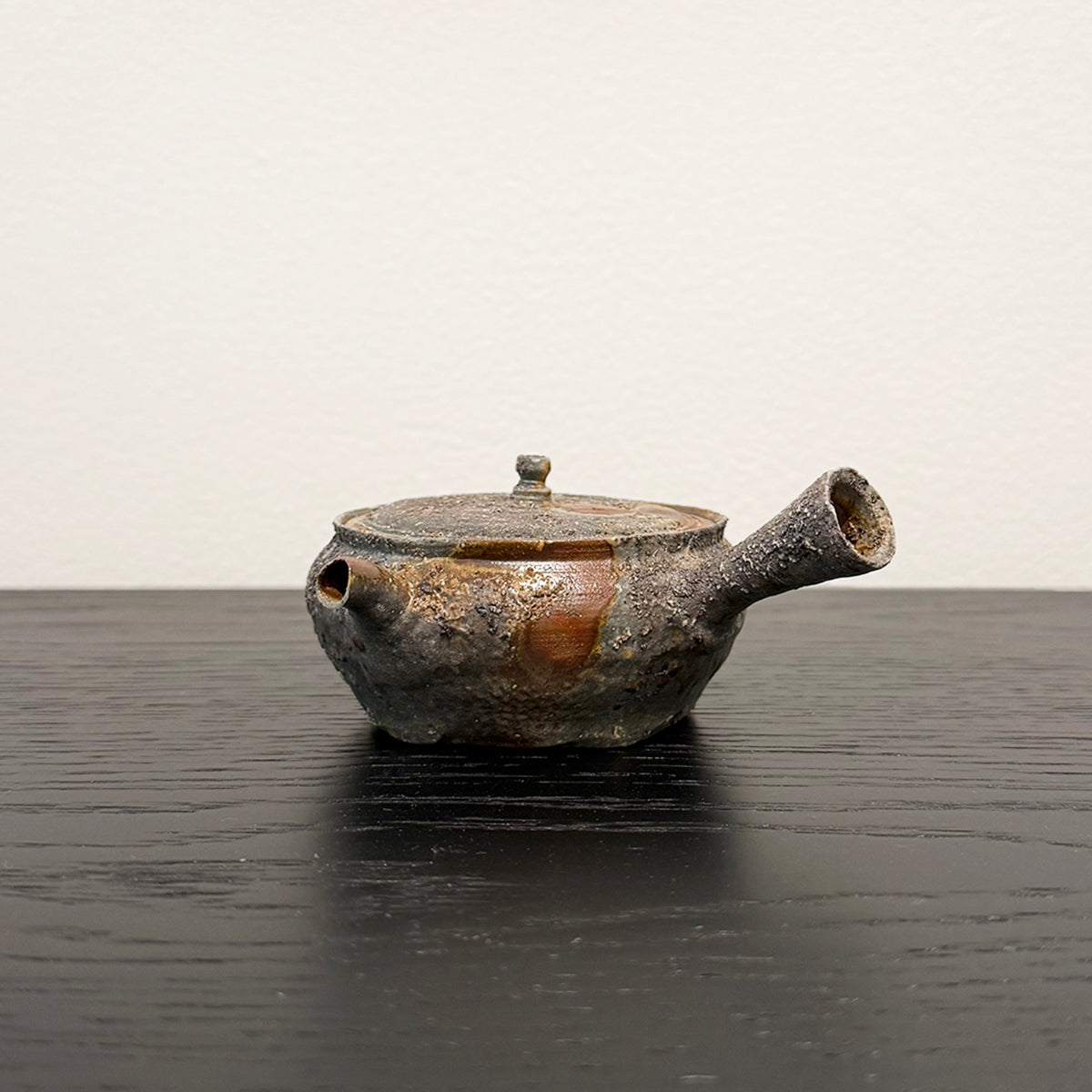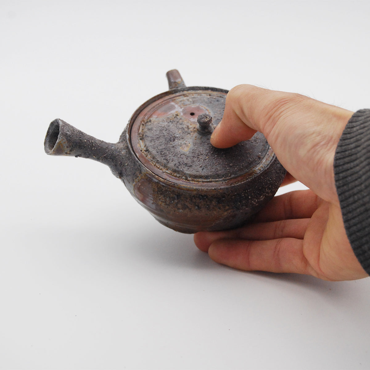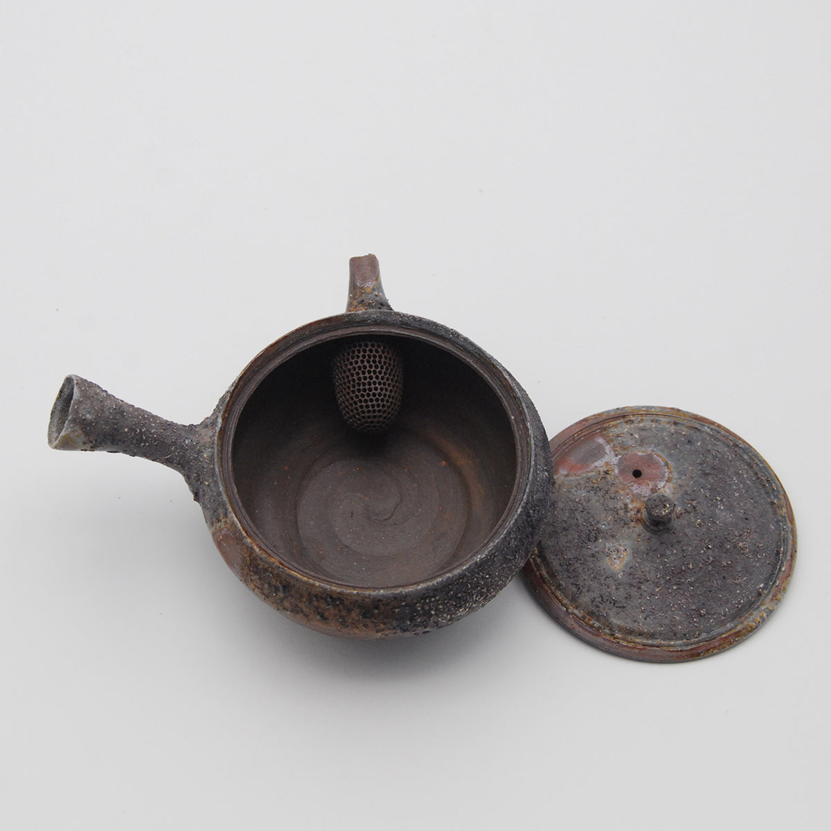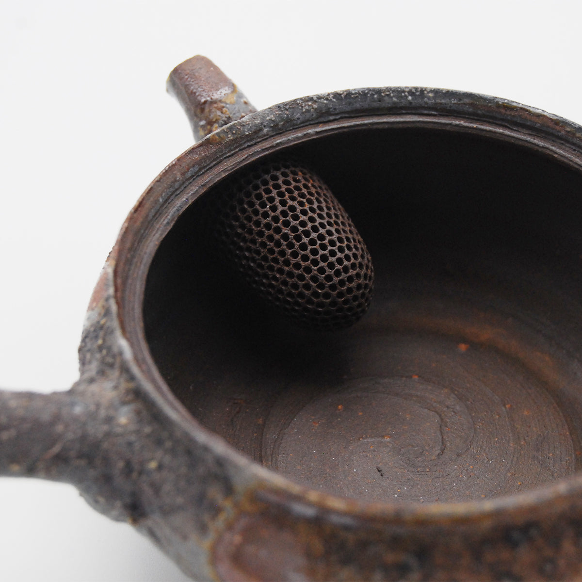 This exceptional Bizen teapot is a masterpiece that encapsulates the region's characteristic clay-making and specialized firing techniques. Its visual appearance is distinctly Bizen; however, its shape surpasses any other teapot crafted there. Each teapot is remarkably lightweight, weighing only 300 grams, and is equipped with a handcrafted strainer featuring 400 to 600 holes. The strainer is seamlessly integrated into the body's opening, ensuring an unobstructed flow that enhances the overall brewing experience. Every piece is unique, displaying melted ash textures, hidasuki rope markings, and red and black scorch marks. Every perspective reveals intricate details to be appreciated over time.