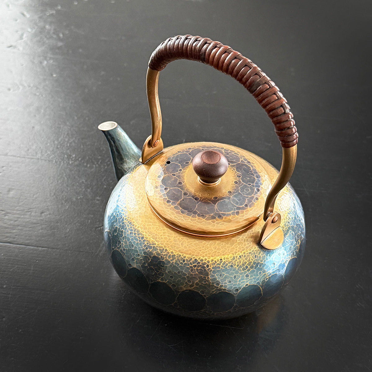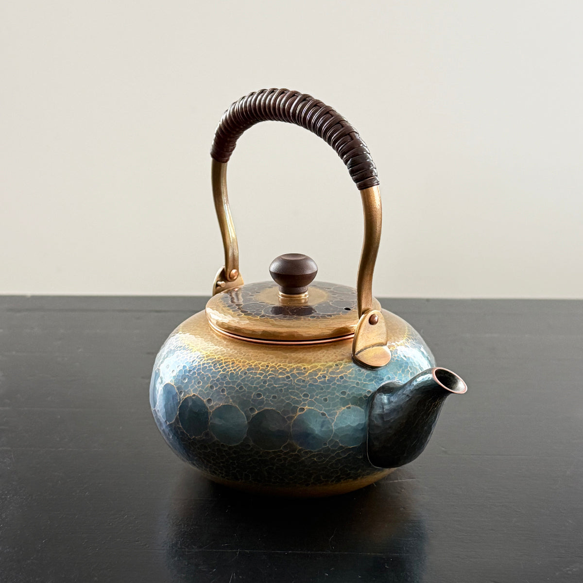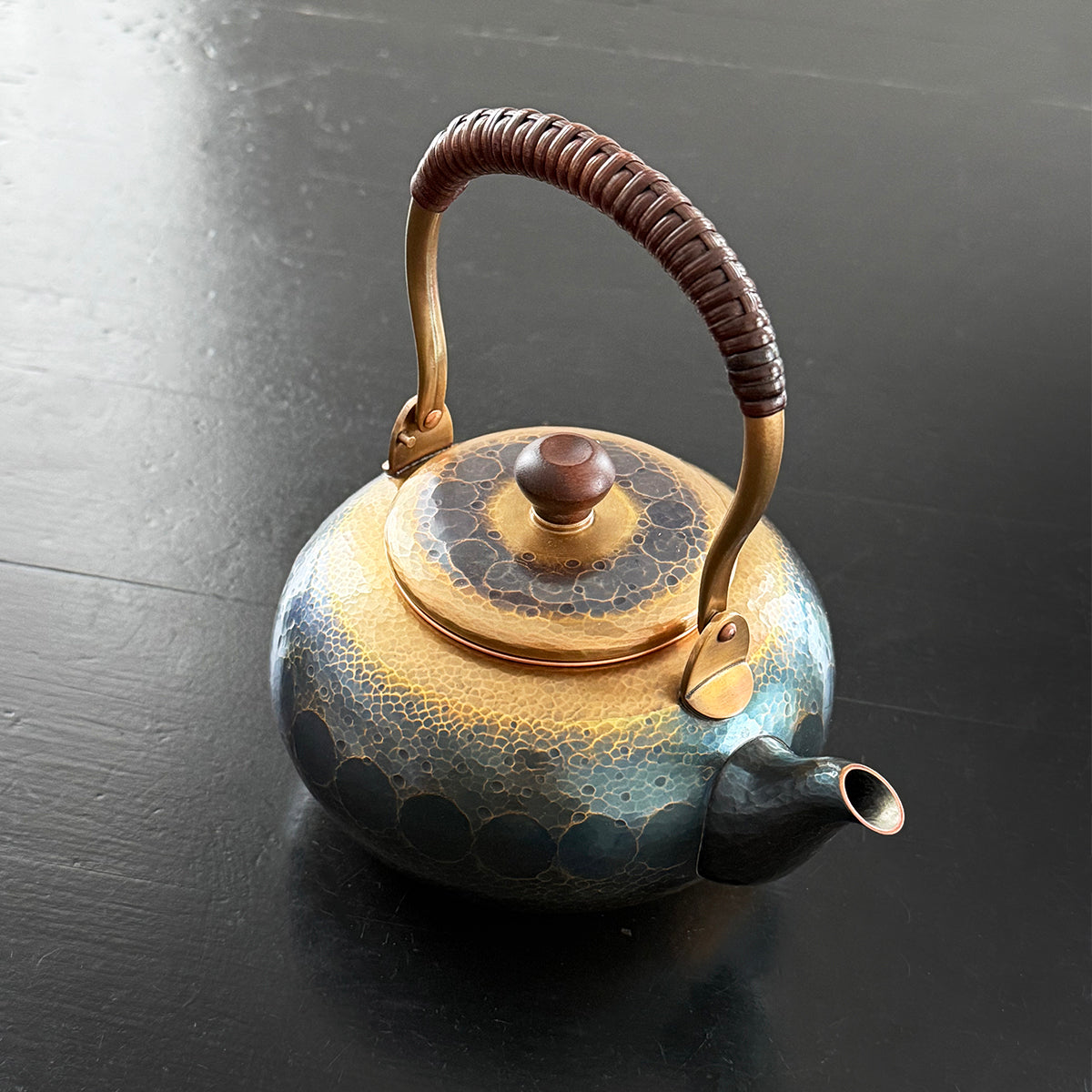Crafted with a timeless, elegant design, this teapot efficiently retains high temperatures, making it perfect for dark or aged teas. The general rule of practice for teapots is that the higher the quality of the tea, the smaller the brewing vessel, to create a more concentrated taste through shorter steepings and to thoroughly enjoy each successive brewing. This teapot features a removable copper basket strainer. The textured body showcases delicate hammer marks and a rustic handle adorned in bamboo. As it is used regularly, the teapot will develop a one-of-a-kind patina, giving it a unique charm. The natural patina is not painted on; it is created through a traditional process using raw copper.