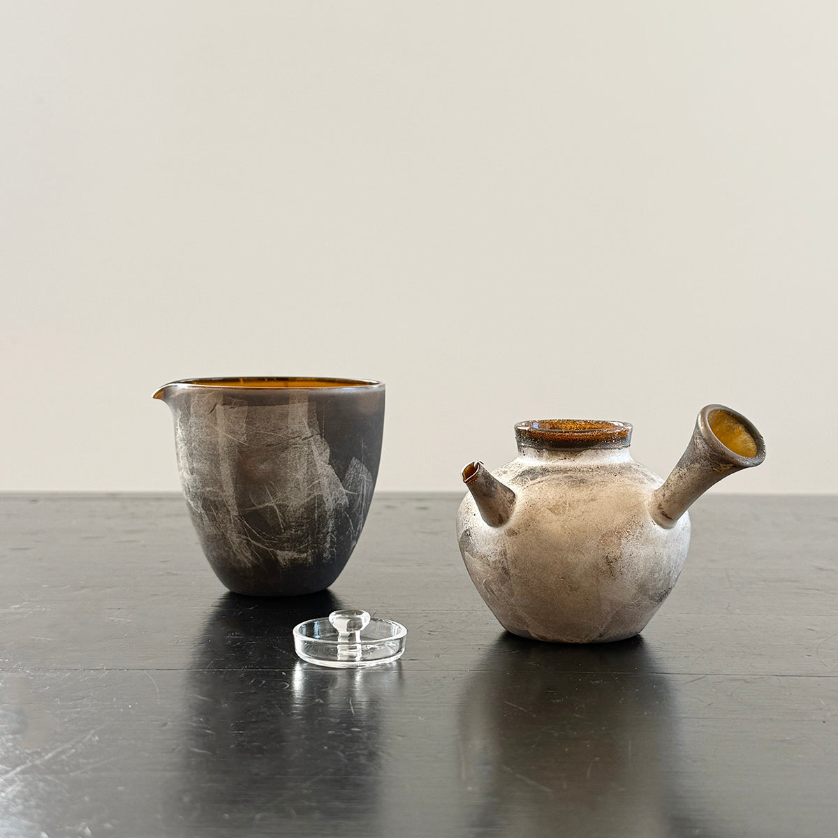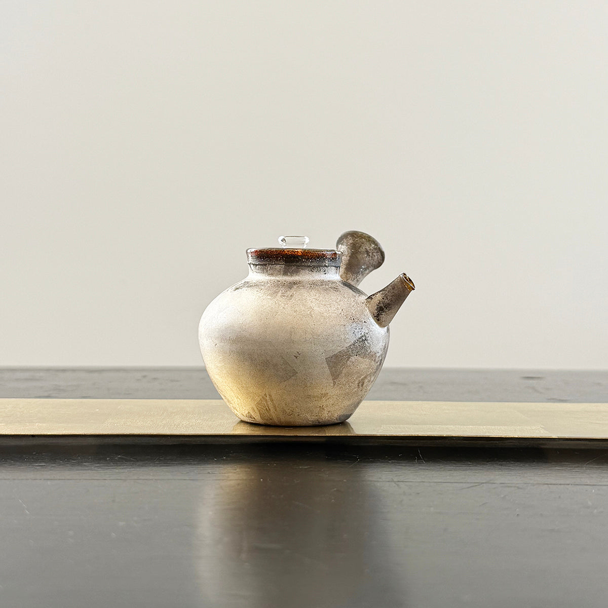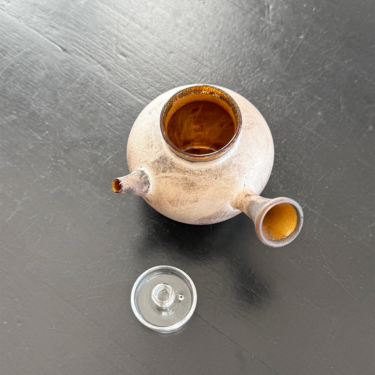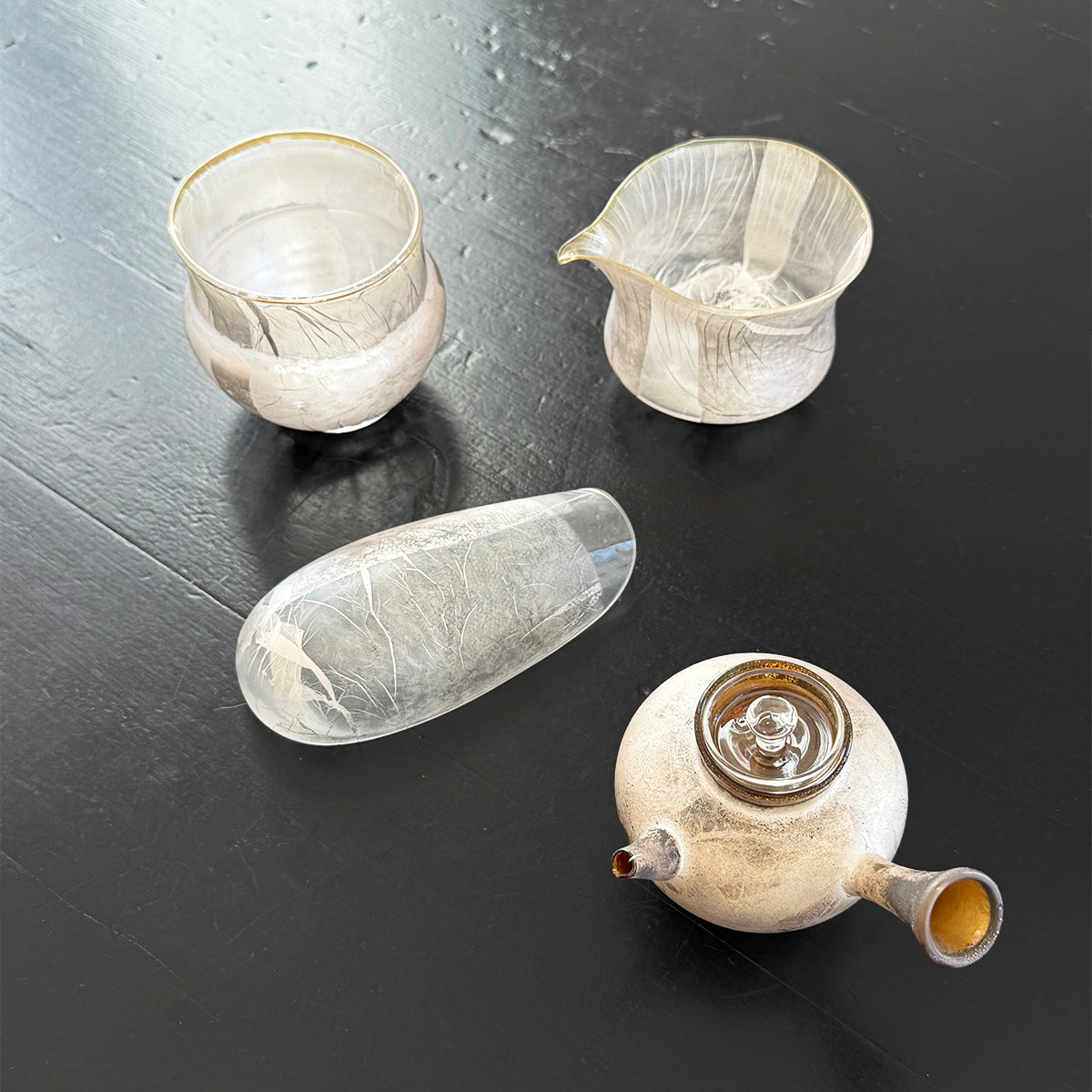 Each piece is formed using the lampworking technique and is made of high borosilicate heat-resistant glass and gold and silver foil.
