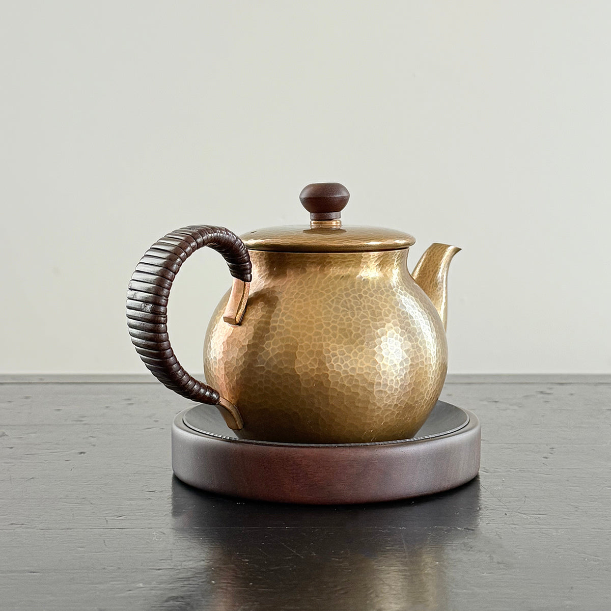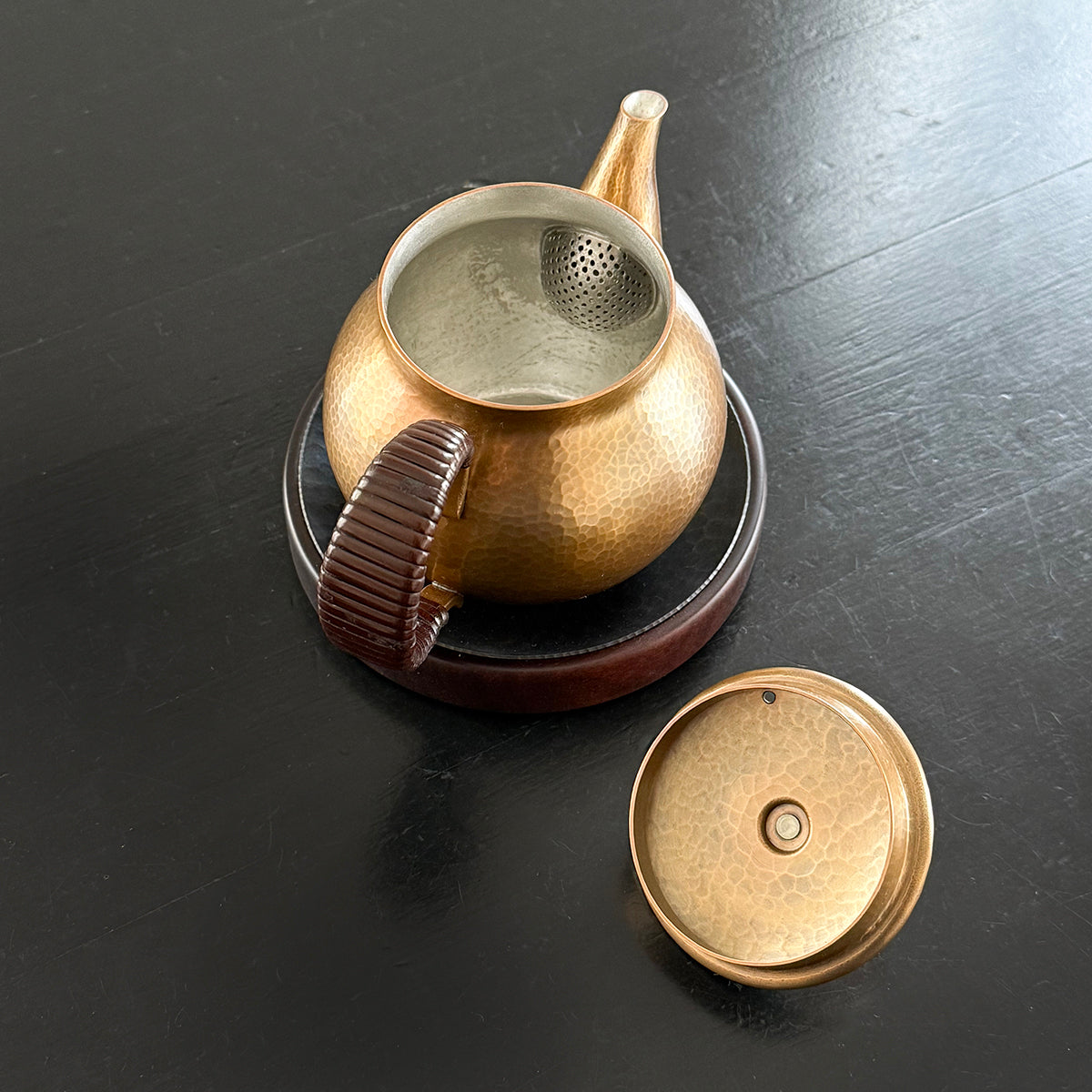 Crafted with a timeless, elegant design this teapot efficiently retains high temperatures, perfect for dark or old teas. The general rule of practice for teapots is that the higher the quality of the tea, the smaller the brewing vessel to create a concentrated taste through shorter steepings and thoroughly enjoy each successive brewing. This teapot features a built-in strainer so you can put the tea directly in and allow it to expand and fully release its magnificent taste. The textured body showcases delicate hammer marks and a rustic handle adorned in bamboo. As it is used regularly, the teapot will develop a one-of-a-kind patina, giving it a unique charm. The natural patina is not painted on but created through a traditional process with raw copper.