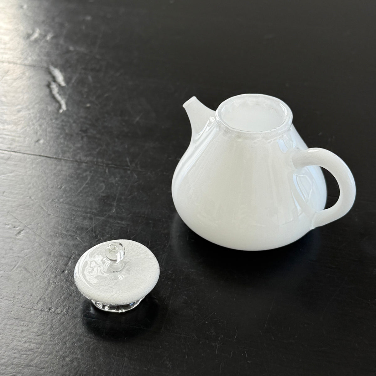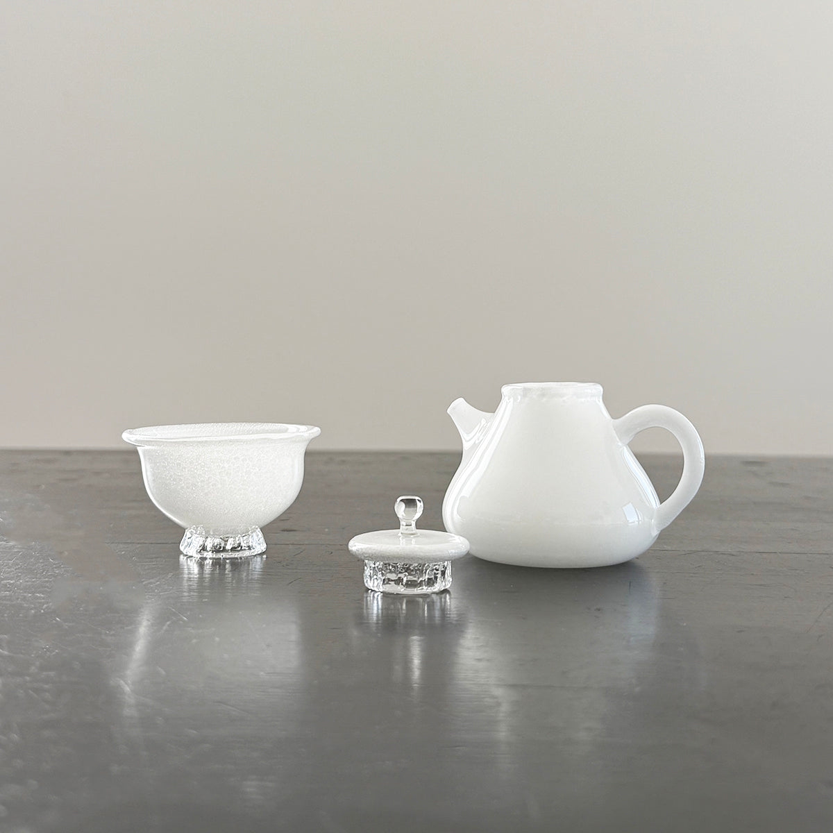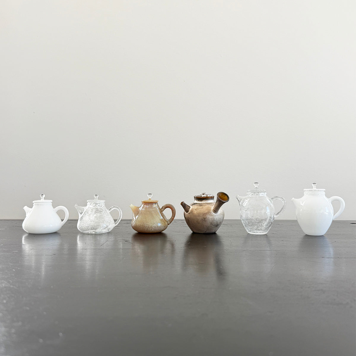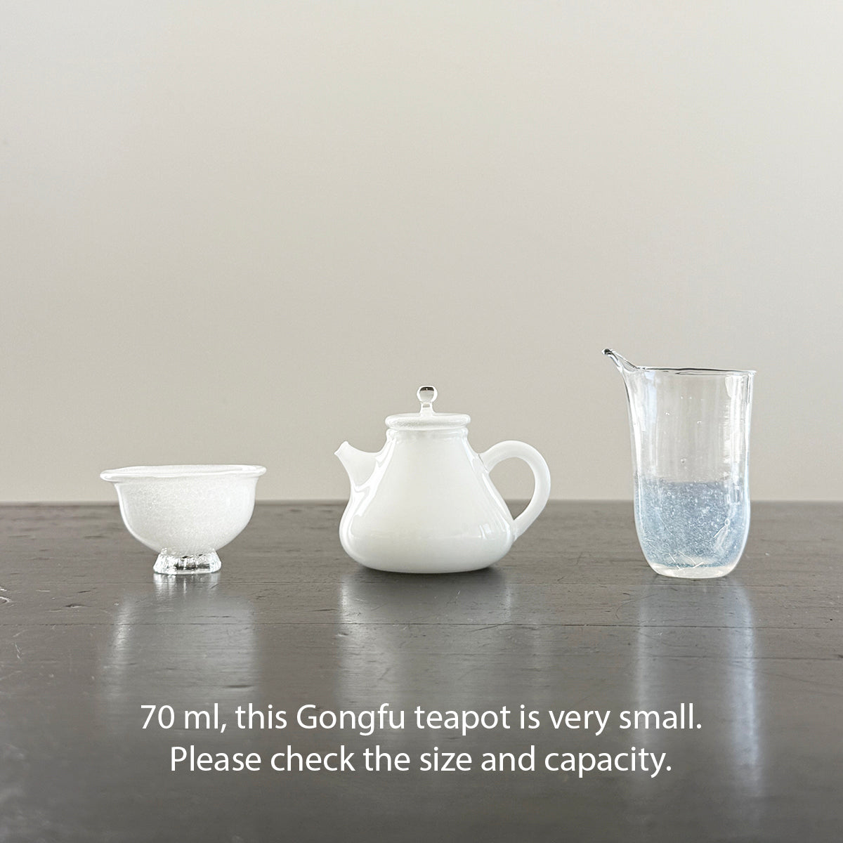 Gong-fu style pieces are intended for the traditional Chinese tea and Japanese Sencha ceremony, as the teapots, cups, and pitchers are very small. Smaller vessels heighten the sensory experience and are preferred for our tastings. Each piece is formed using the lampworking technique and is made of high borosilicate heat-resistant glass.