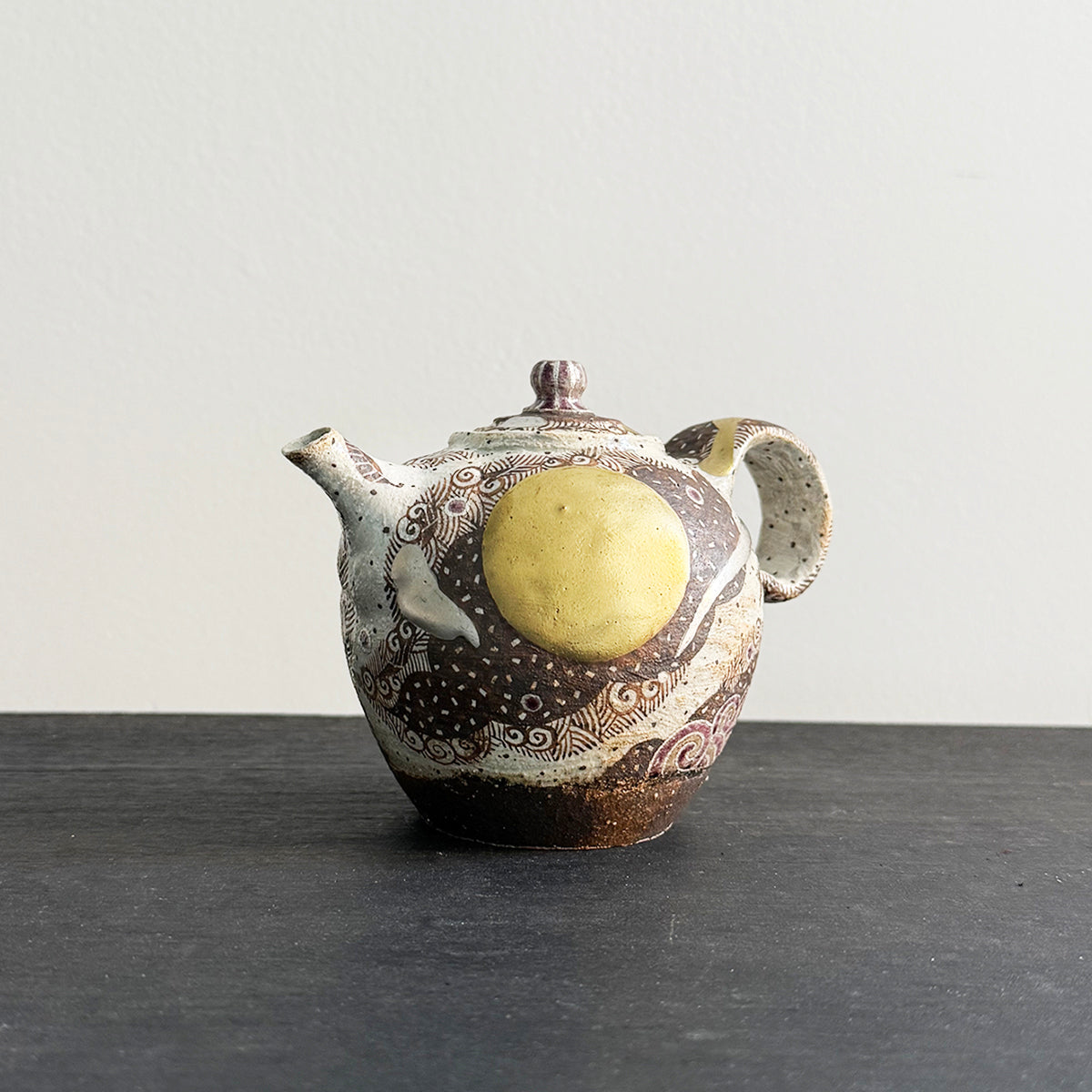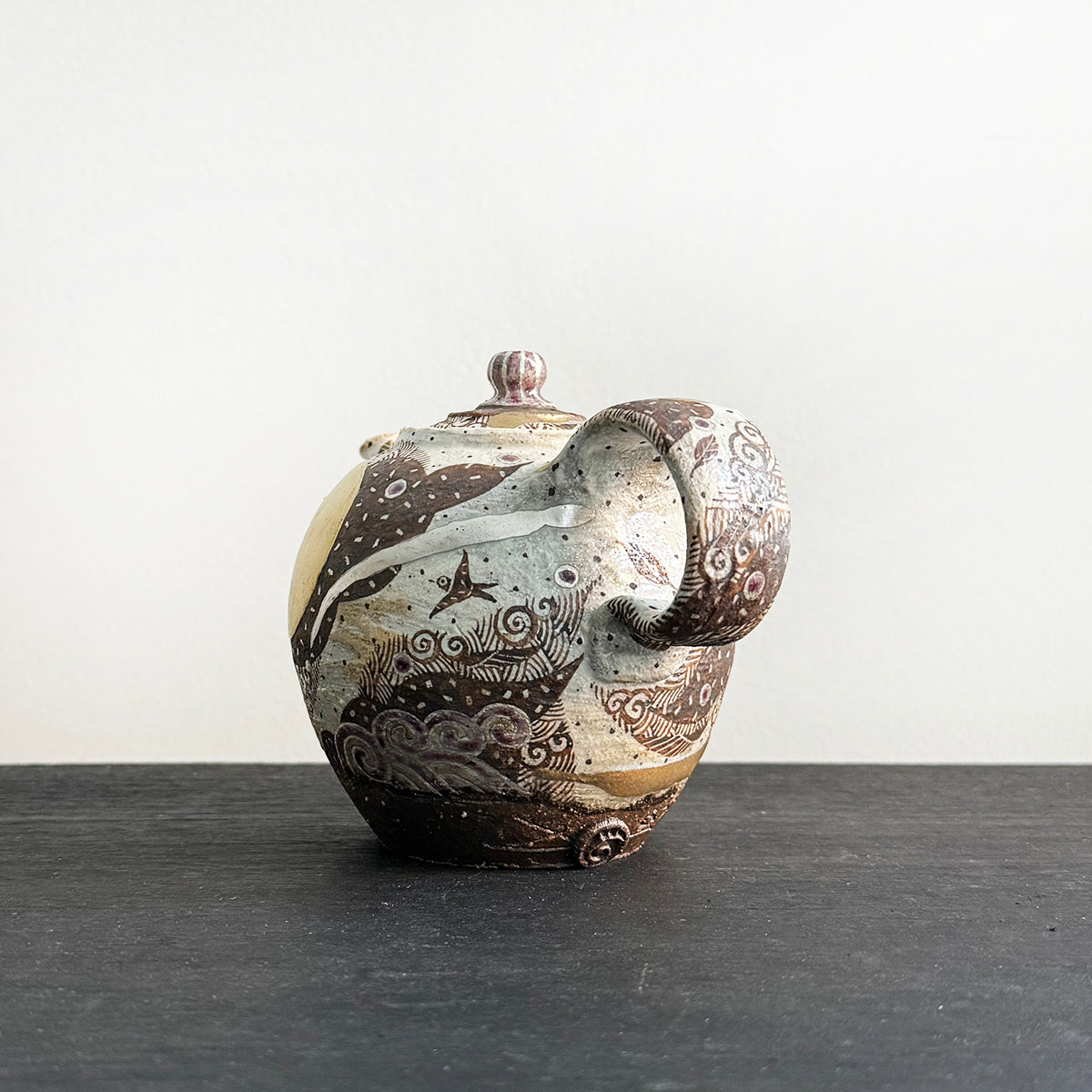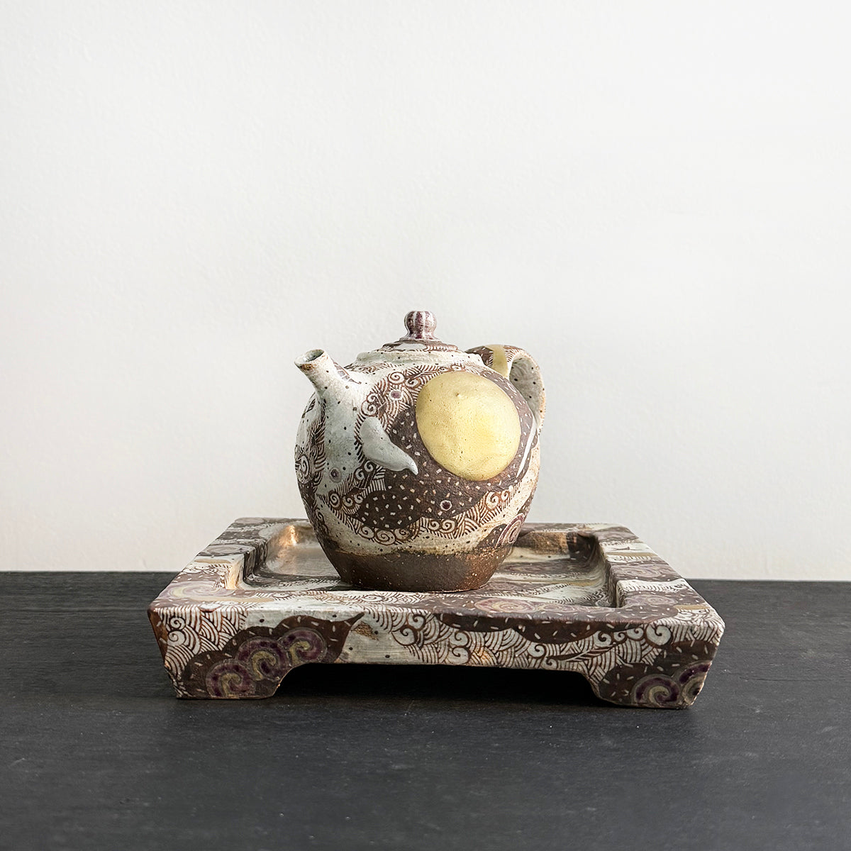 Celebrating our seventh Koji Usaka collection with a Solo Exhibition, one of the largest selections to be offered outside of Japan. Welcome to the magical world of Koji Usaka! Ceramic pieces are imbued with folklore and the imagination of this acclaimed potter, who has been creating functional artworks since 1980, when he established his first kiln in Tochigi, Japan. He and his wife and a sculptor, Yayoi, are most famous for their hand-painted Aka-e (red) or Seimon (multi-color) glazed ceramics that adorn masterfully crafted pieces. His works are instantly recognizable and contain a whole universe of their own. The designs often include a detailed arabesque pattern with the moon, clouds, mountains, and even forest creatures, making Hokkaido such a special place.