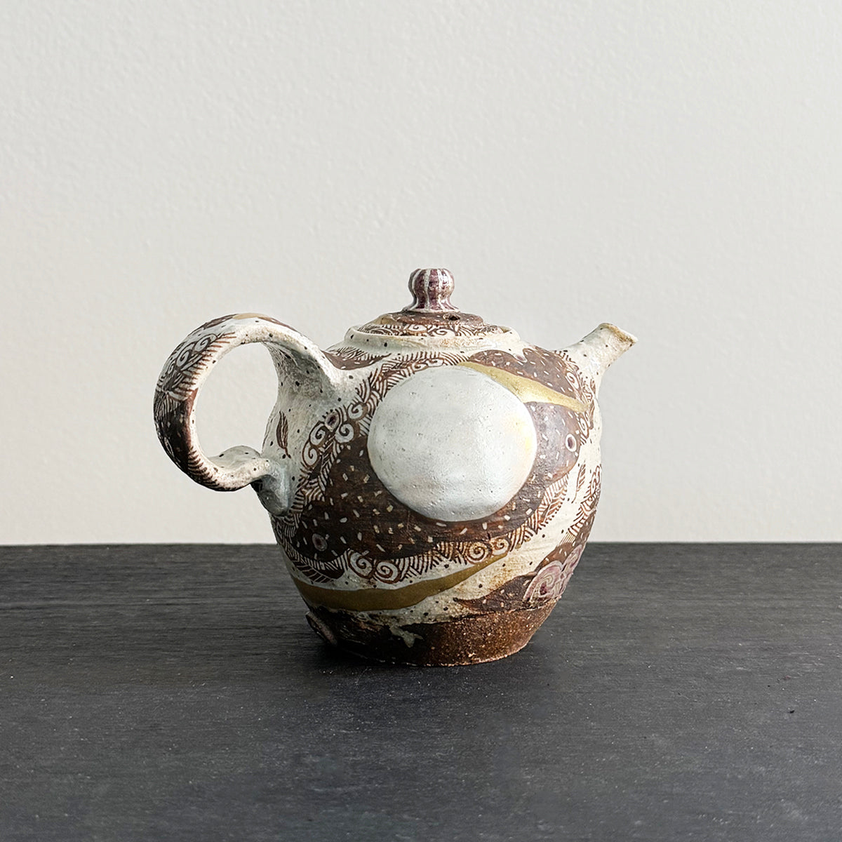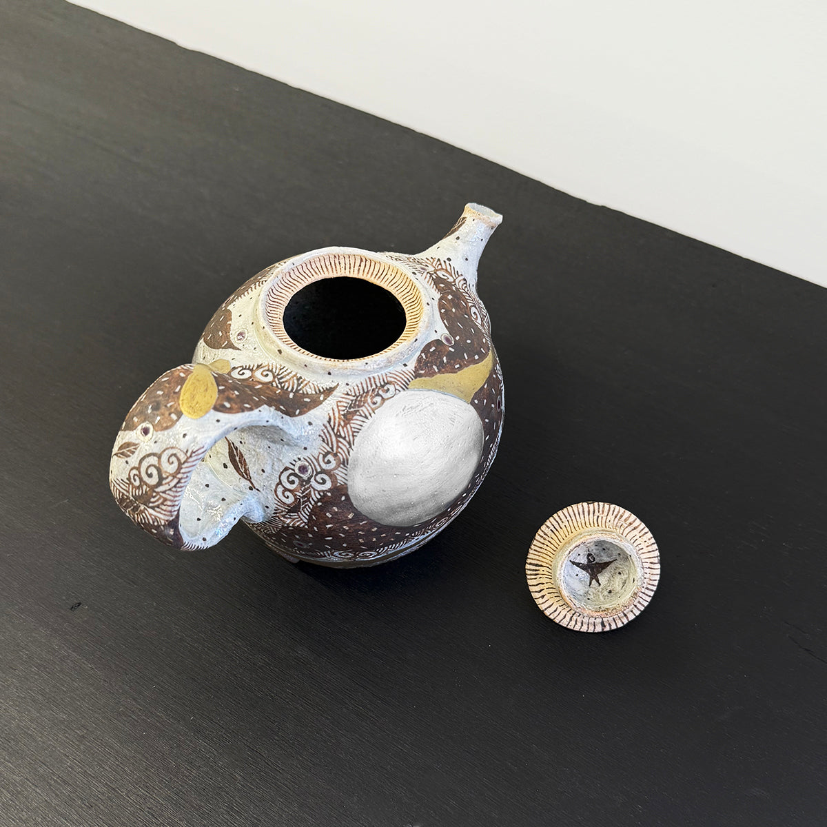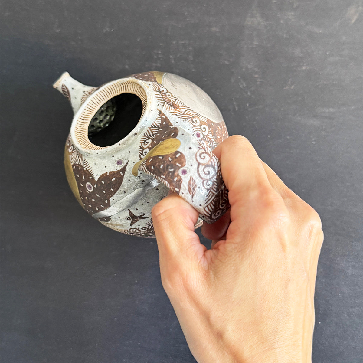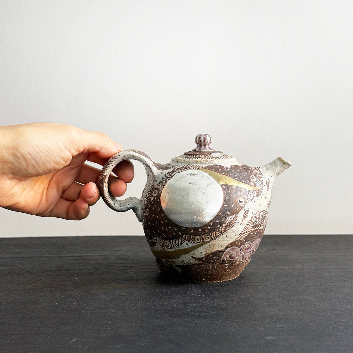 Celebrating our seventh Koji Usaka collection with a Solo Exhibition, one of the largest selections to be offered outside of Japan. Welcome to the magical world of Koji Usaka! Ceramic pieces are imbued with folklore and the imagination of this acclaimed potter, who has been creating functional artworks since 1980, when he established his first kiln in Tochigi, Japan. He and his wife and a sculptor, Yayoi, are most famous for their hand-painted Aka-e (red) or Seimon (multi-color) glazed ceramics that adorn masterfully crafted pieces. His works are instantly recognizable and contain a whole universe of their own. The designs often include a detailed arabesque pattern with the moon, clouds, mountains, and even forest creatures, making Hokkaido such a special place.