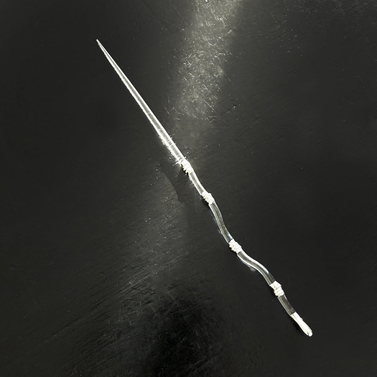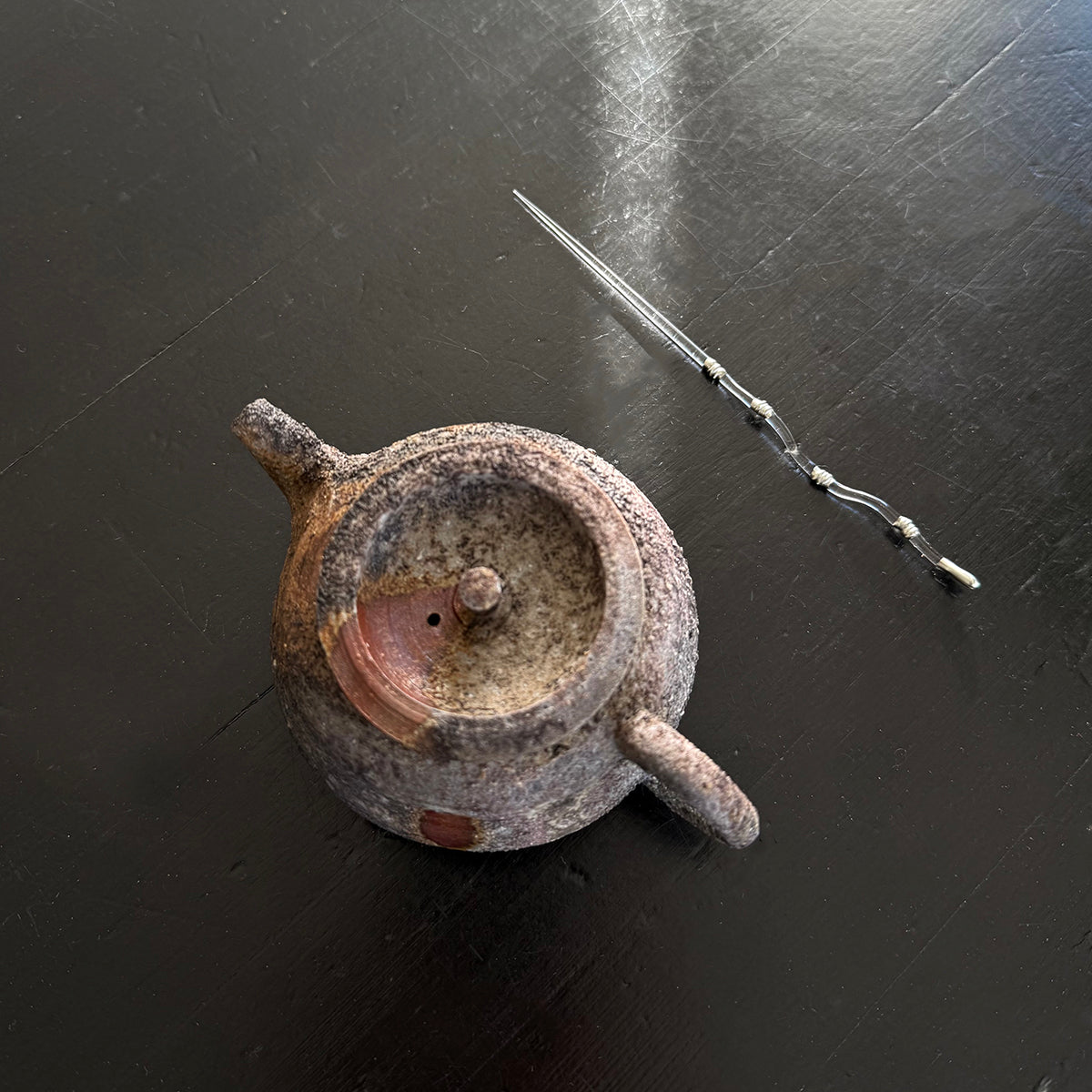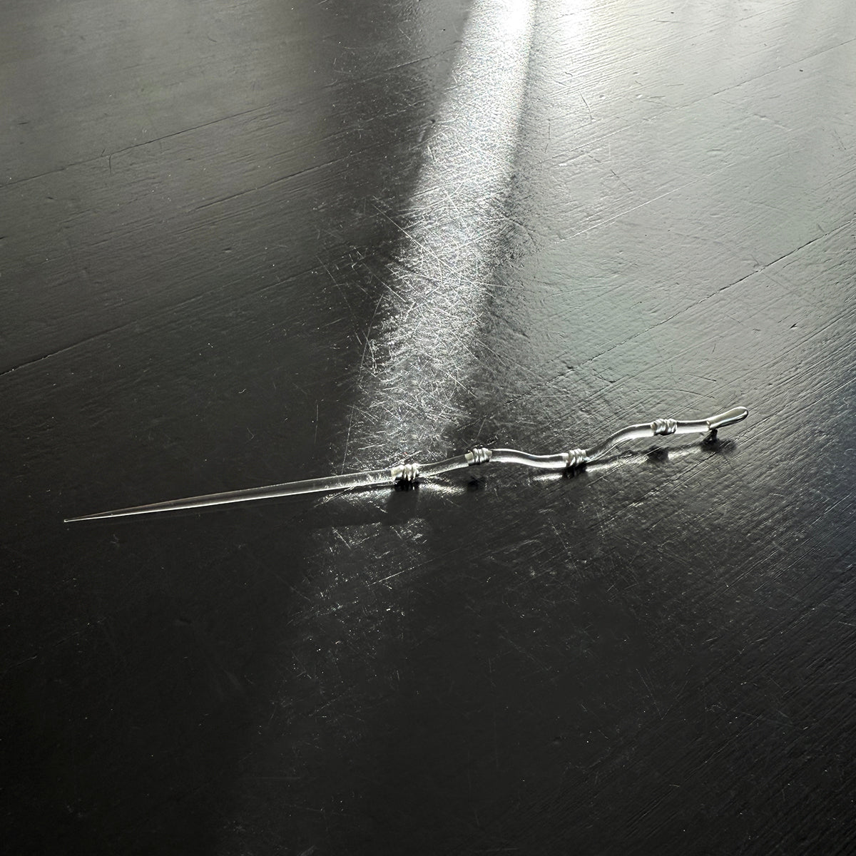 A tea utensil used for clearing tea leaf clogged spouts of teapots and for guiding the leaves from a tea scoop carefully into the small opening of a teapot. Made of high borosilicate heat-resistant glass and silver foil.