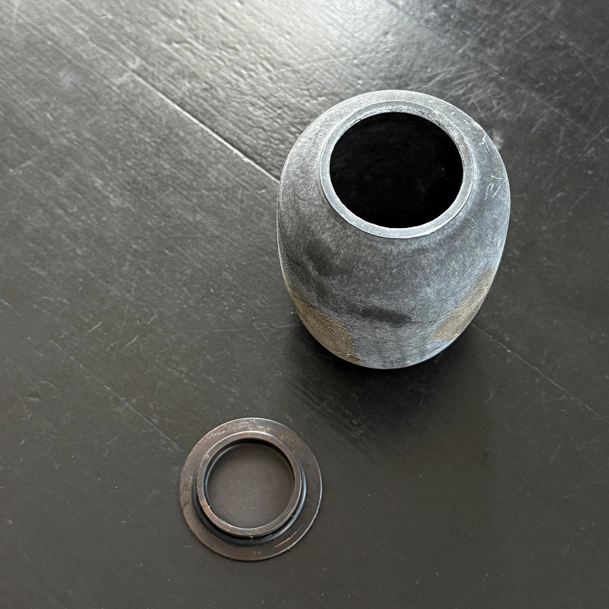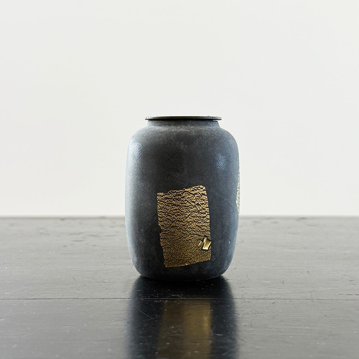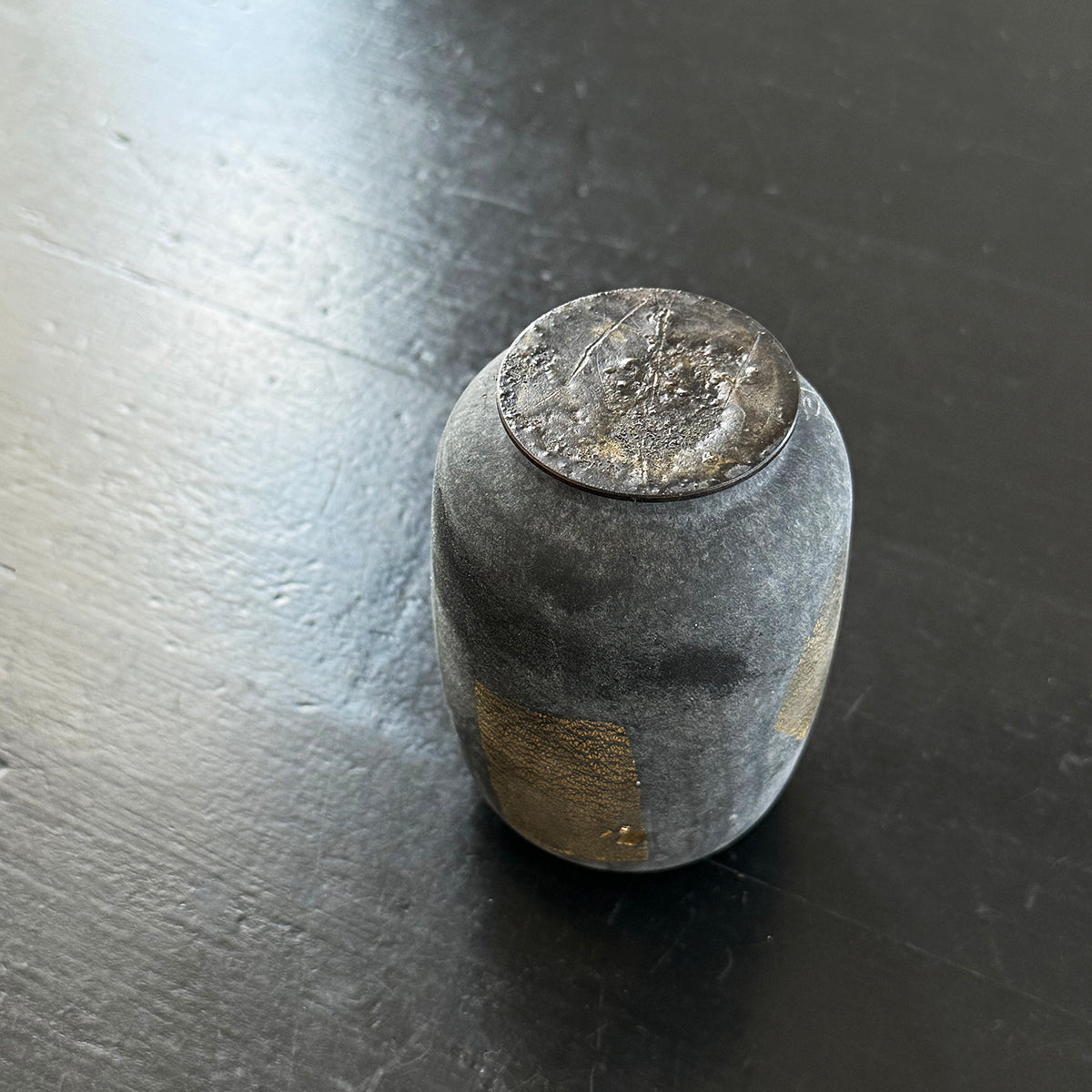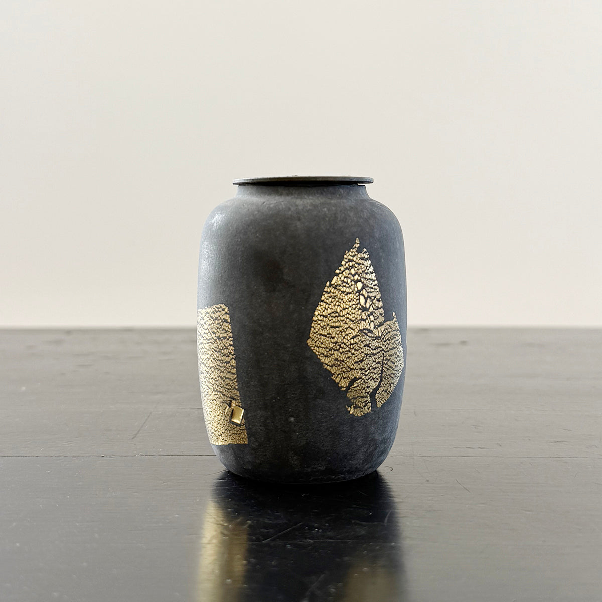 A classic-shaped tea canister for storing tea made of soda-lime glass, gold leaf, and an antiqued copper lid. This exceptionally textured piece has been hand-blown and kiln-cast.