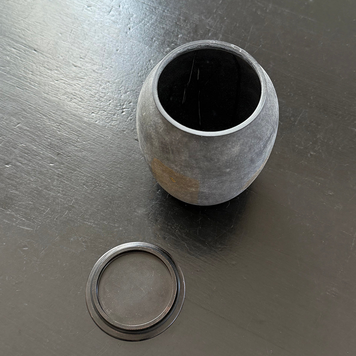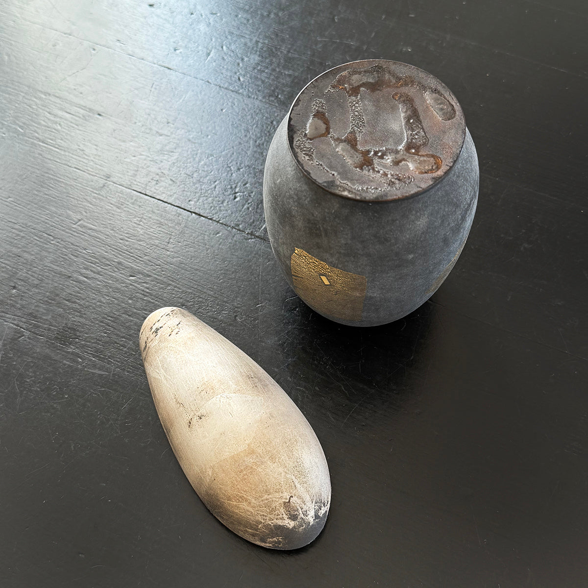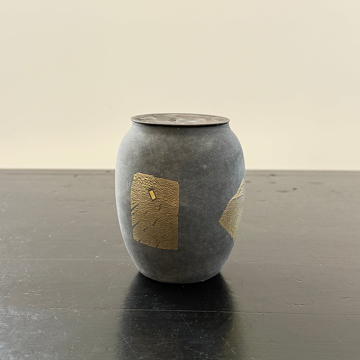 A large classic-shaped tea canister for storing tea made of soda-lime glass, gold leaf, and an antiqued copper lid. This exceptionally textured piece has been hand-blown and kiln-cast.