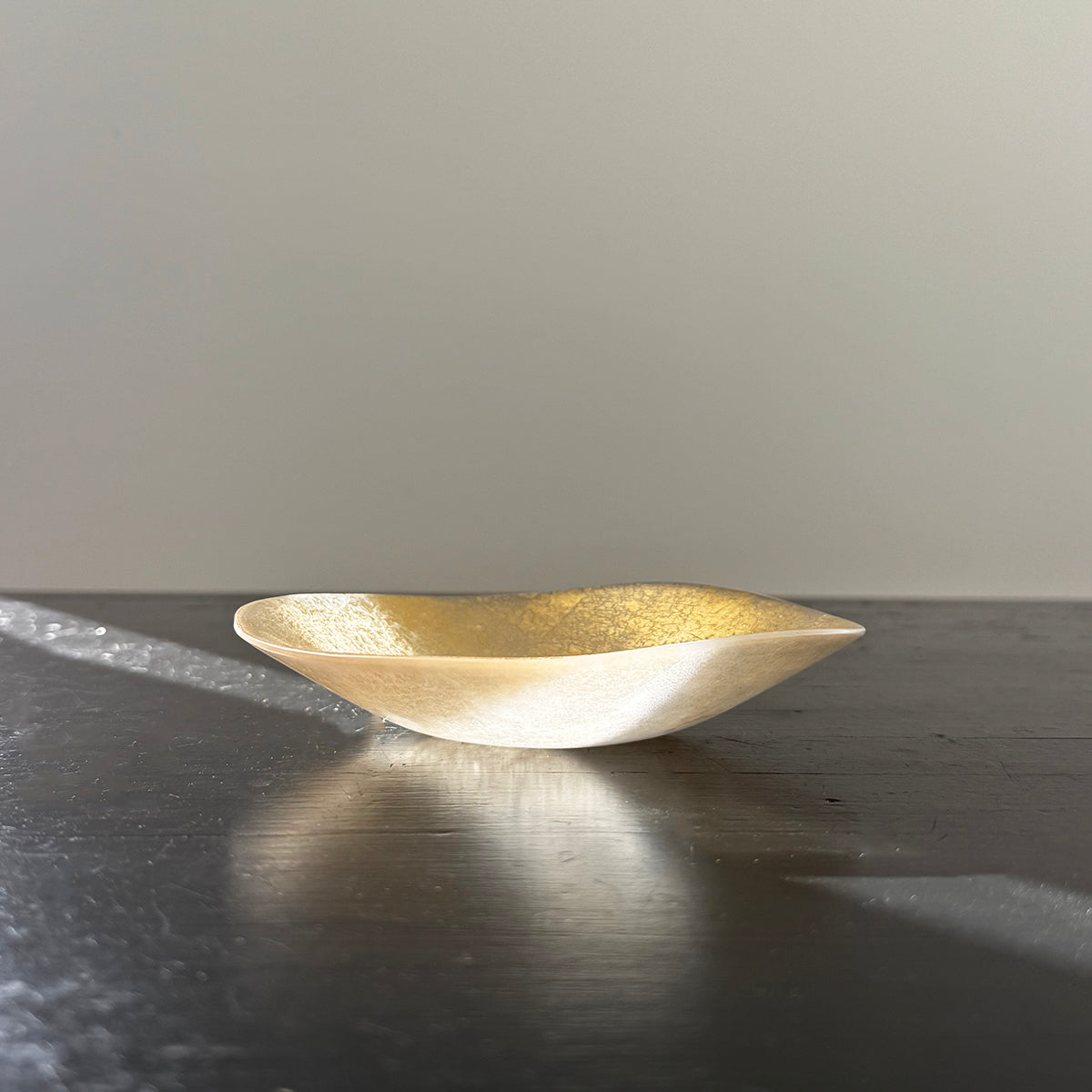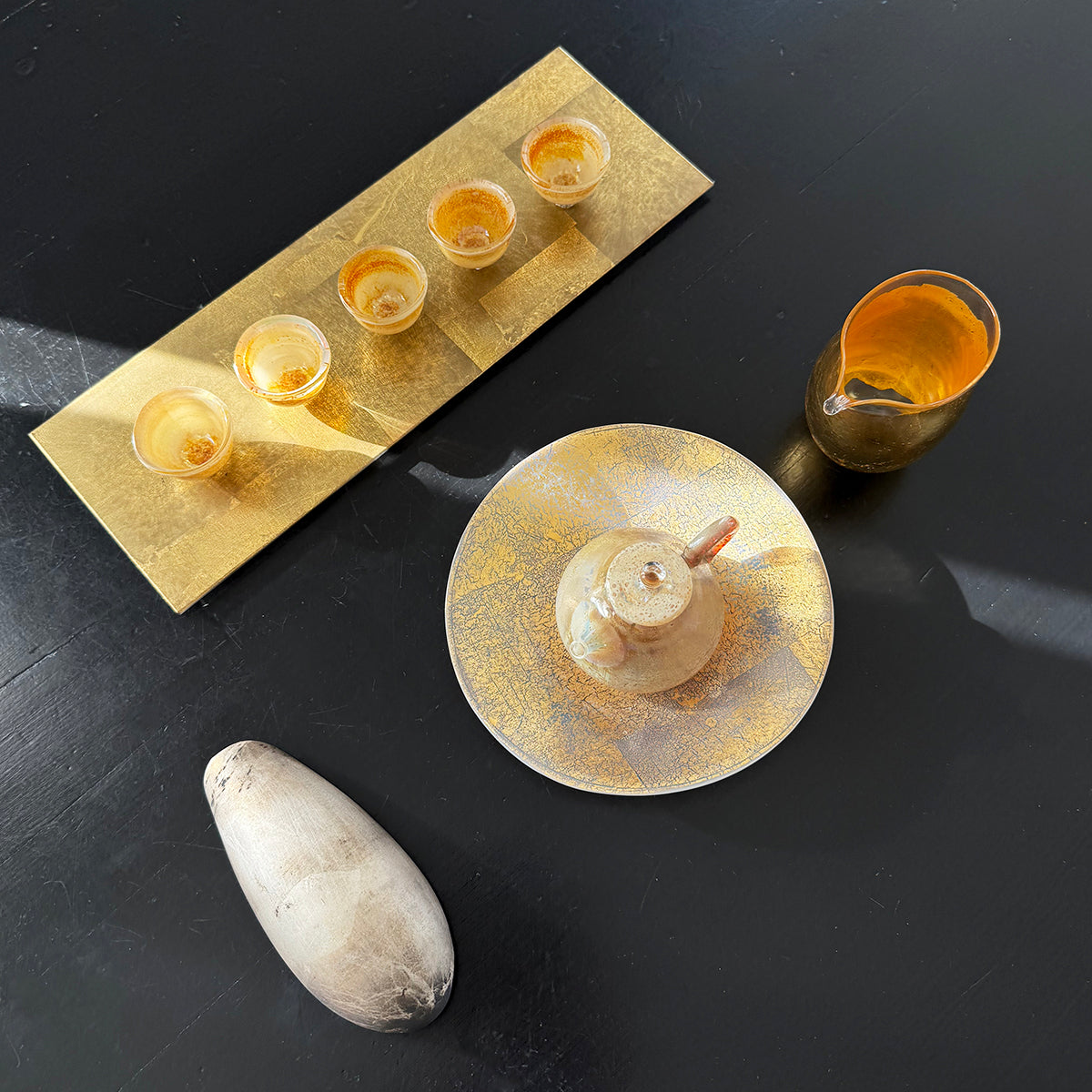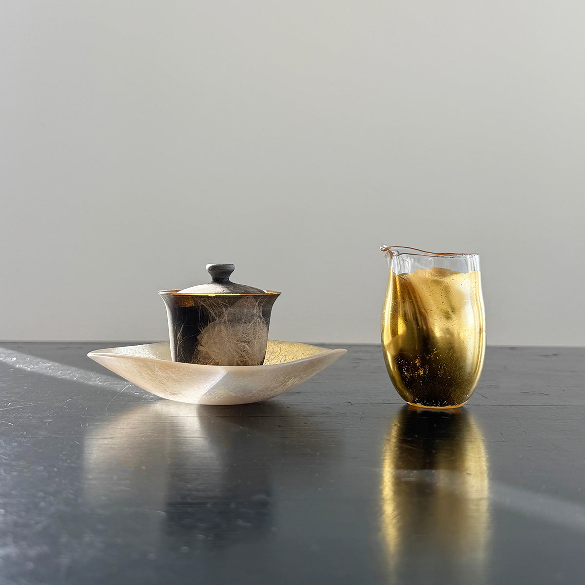 Each unique-shaped teapot bowl is made of hand-blown optical glass and gold foil.