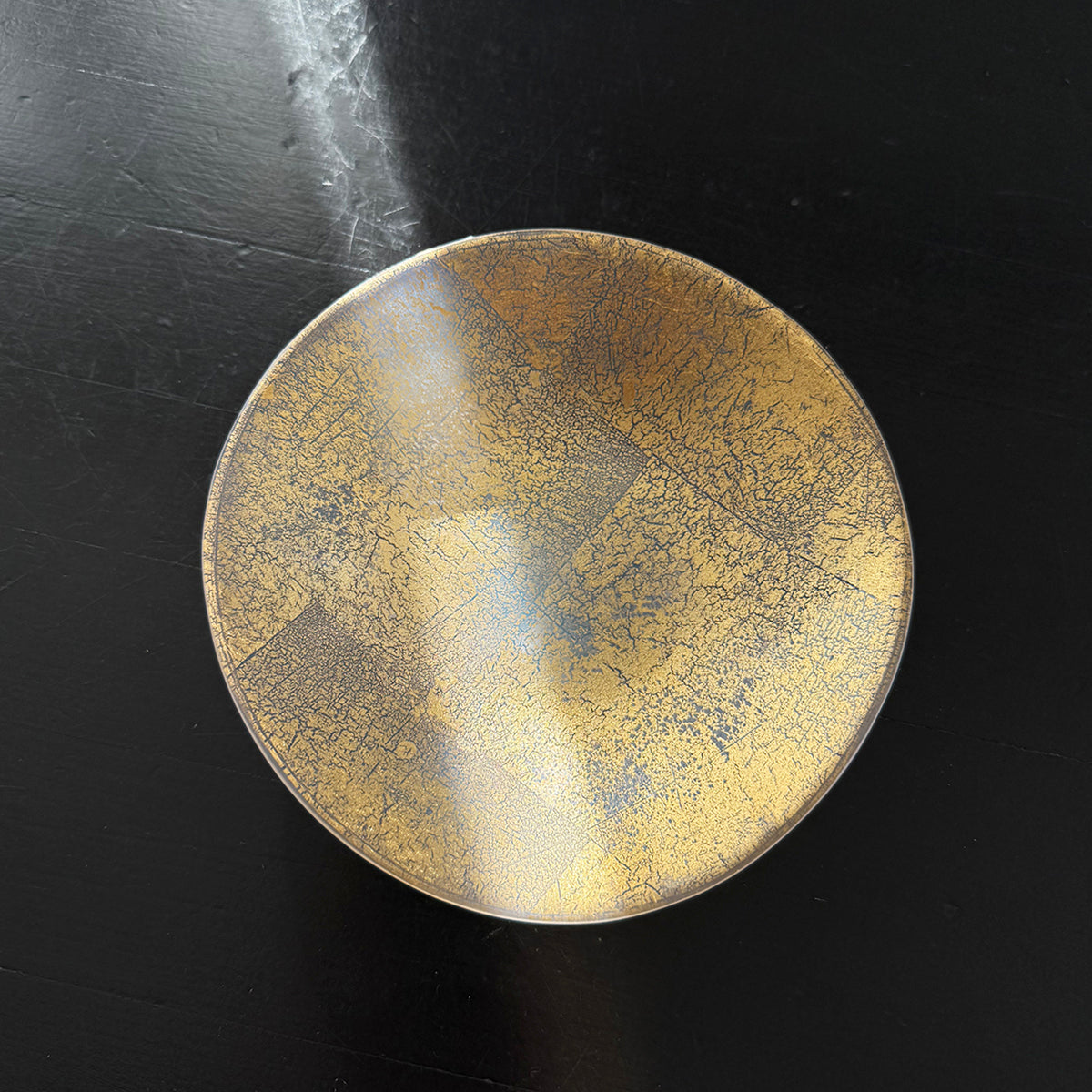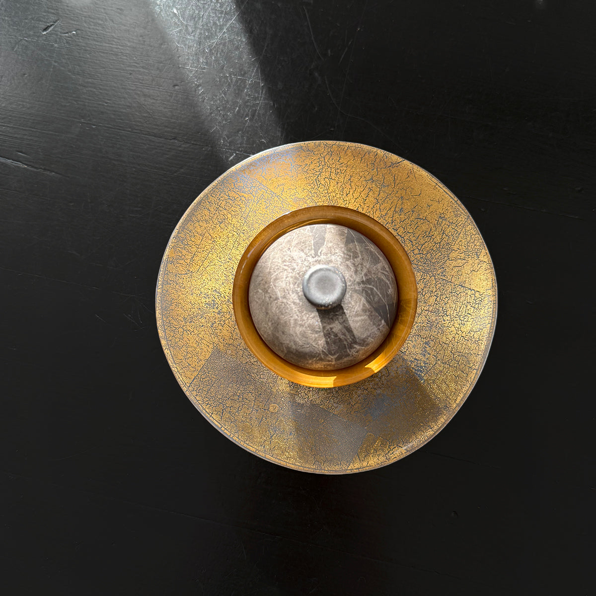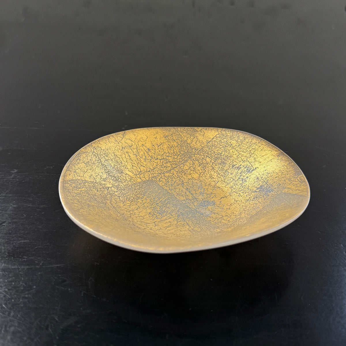 Each unique-shaped teapot bowl is made of hand-blown optical glass and gold foil.
