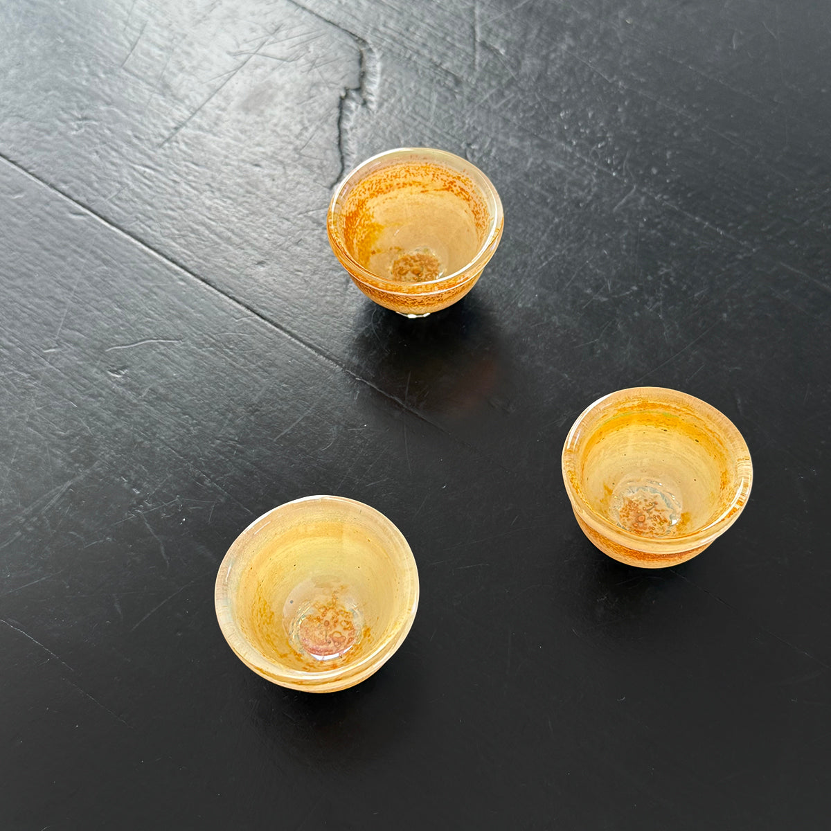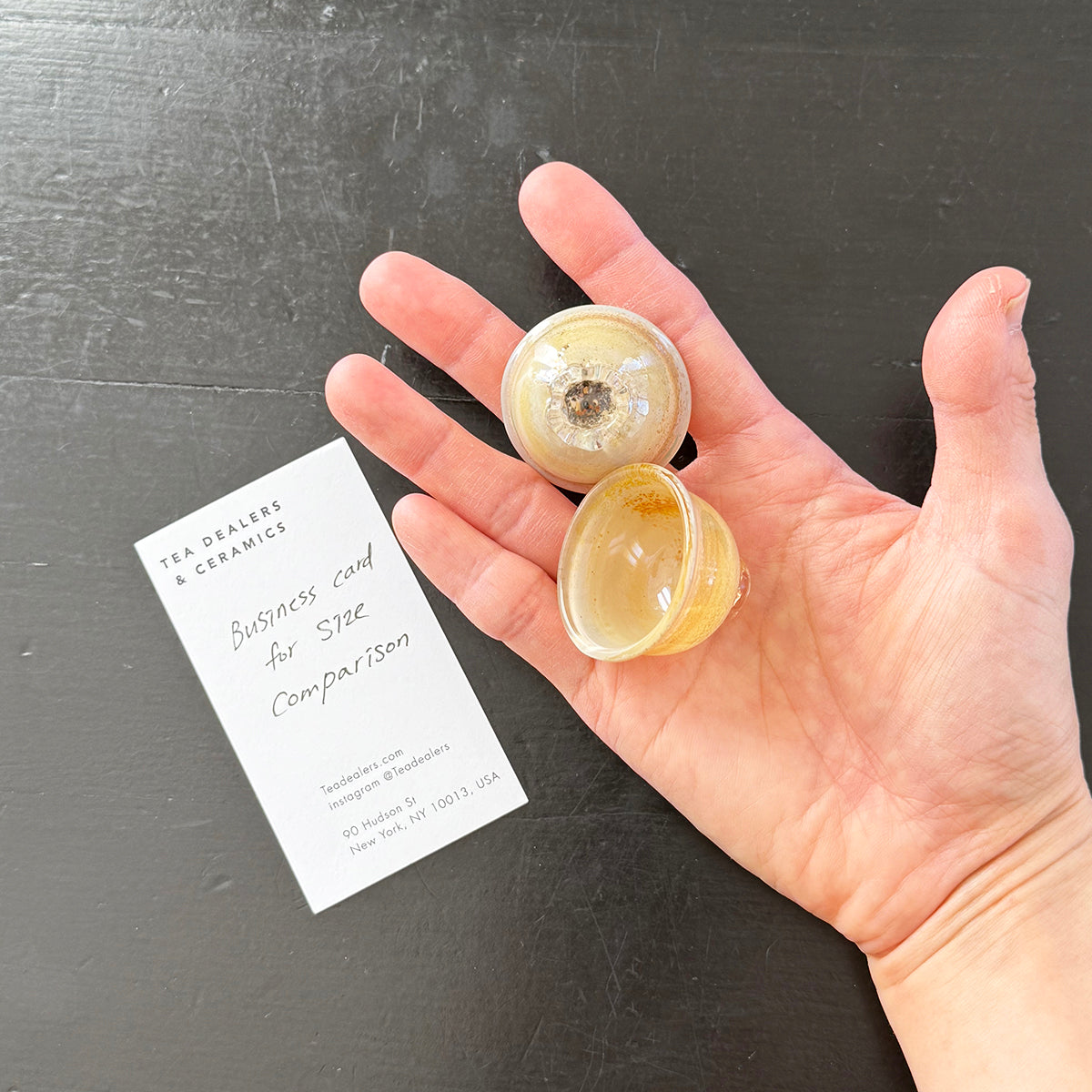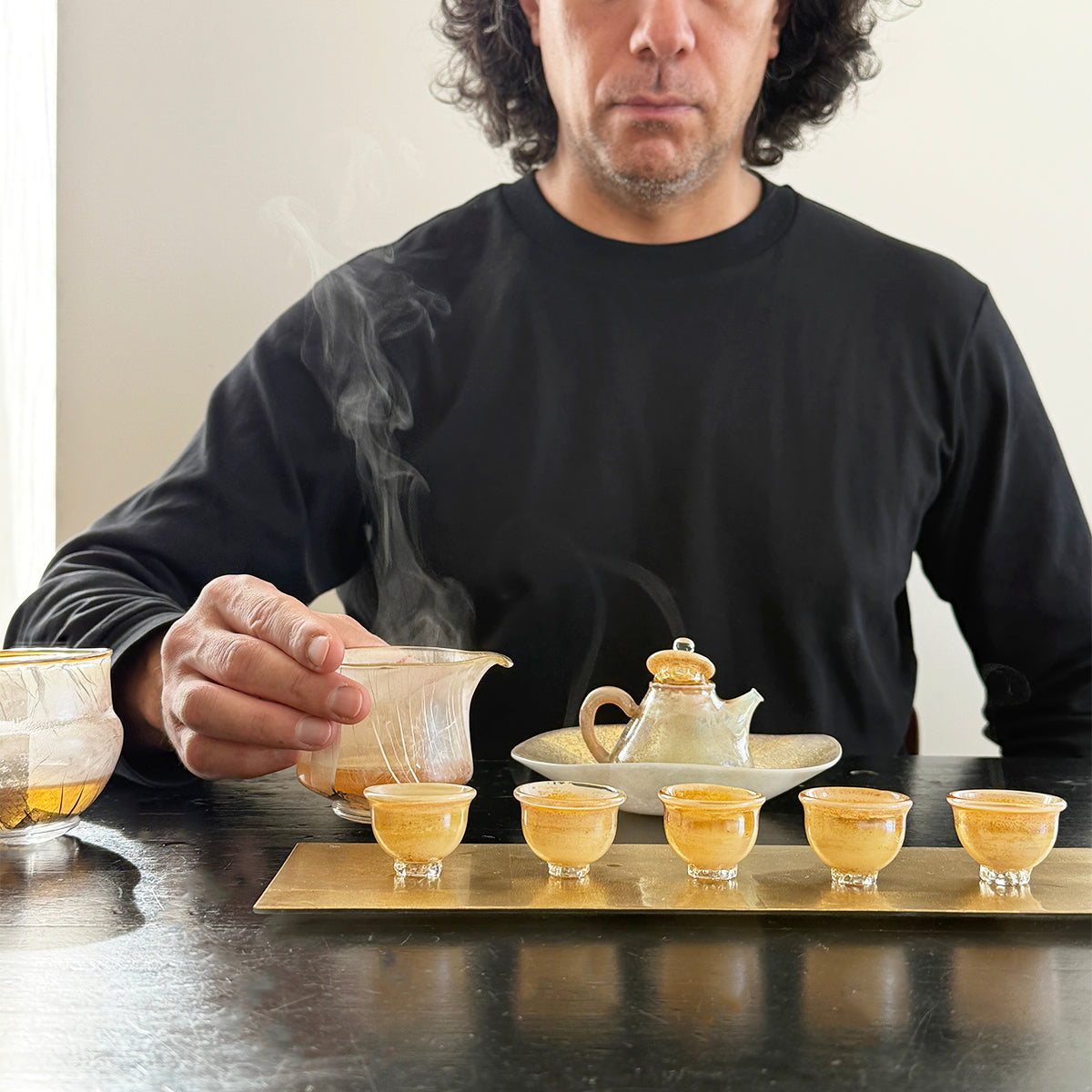 Gong-fu style pieces are intended for the traditional Chinese tea and Japanese Sencha ceremony, as the teapots, cups, and pitchers are very small. Smaller vessels heighten the sensory experience and are preferred for our tastings. Each piece is formed using the lampworking technique and is made of high borosilicate heat-resistant glass and gold and silver foil.