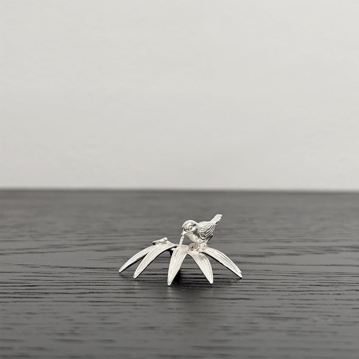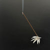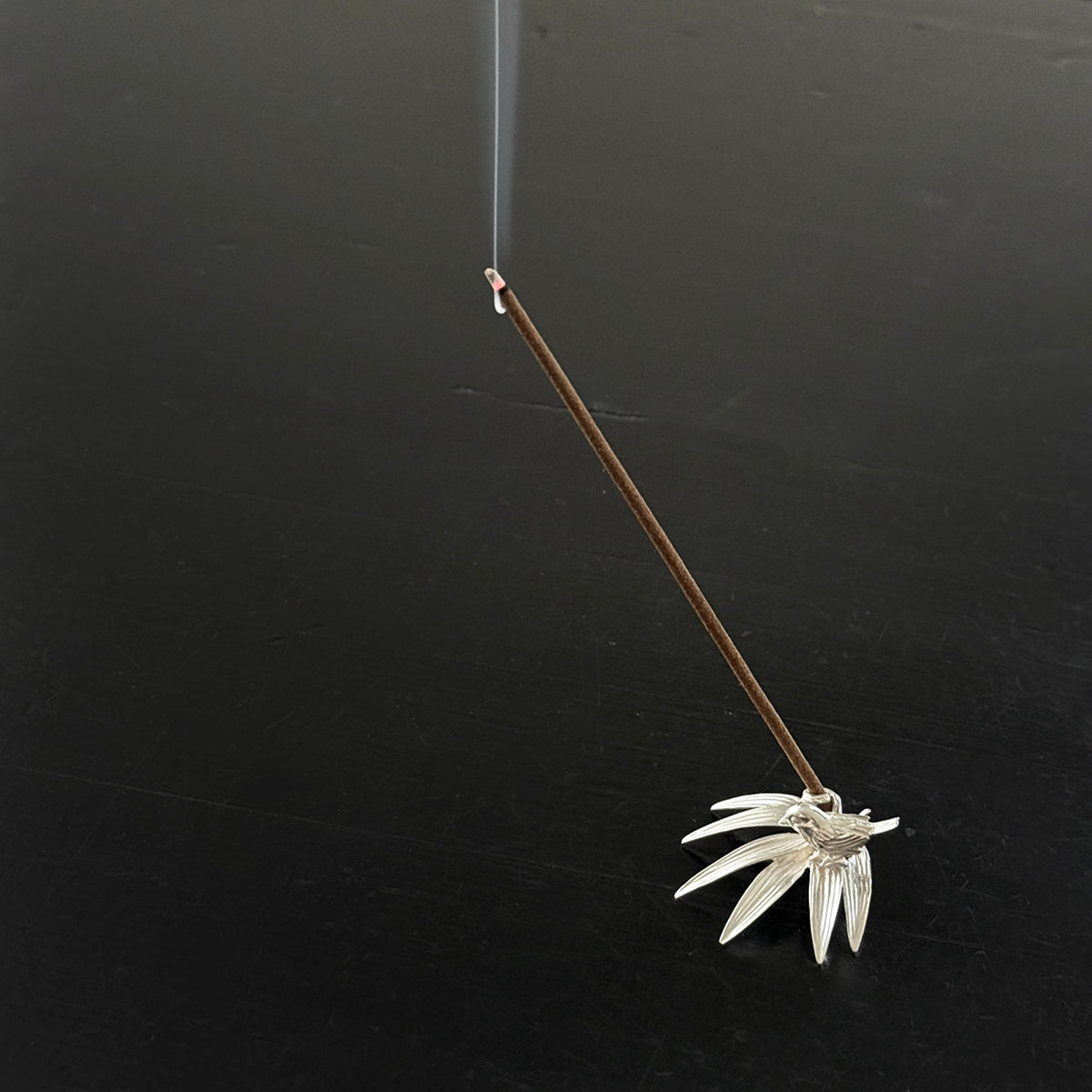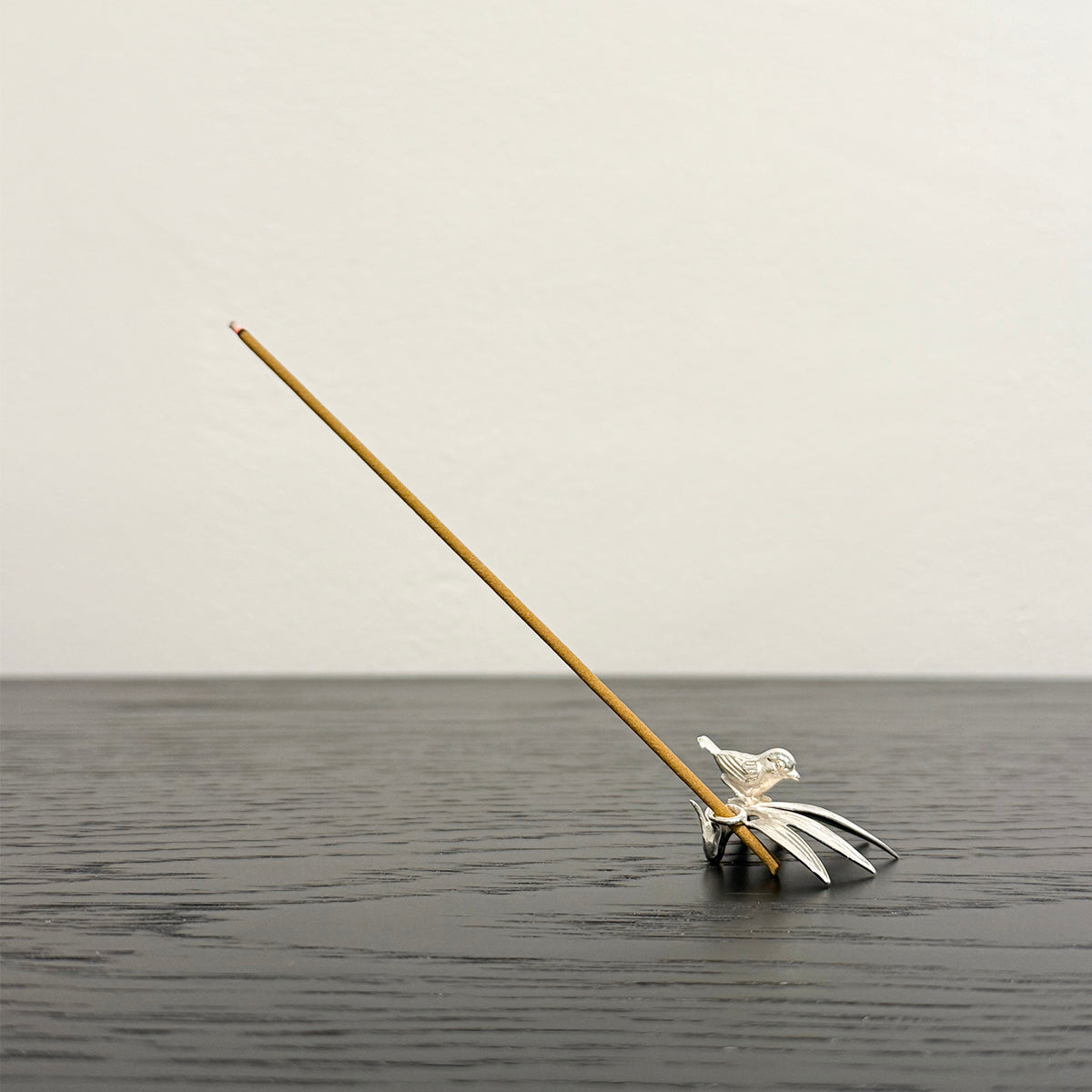 This exquisitely crafted incense holder, fashioned in the shape of a Sparrow sitting on bamboo leaves, is composed of pure silver. With its weight and design, an incense stick can be cradled between its incredibly intricate holder. The silver's brilliance emits a soothing, luminous gleam, making it an undeniably charming sight, even when not in use.
