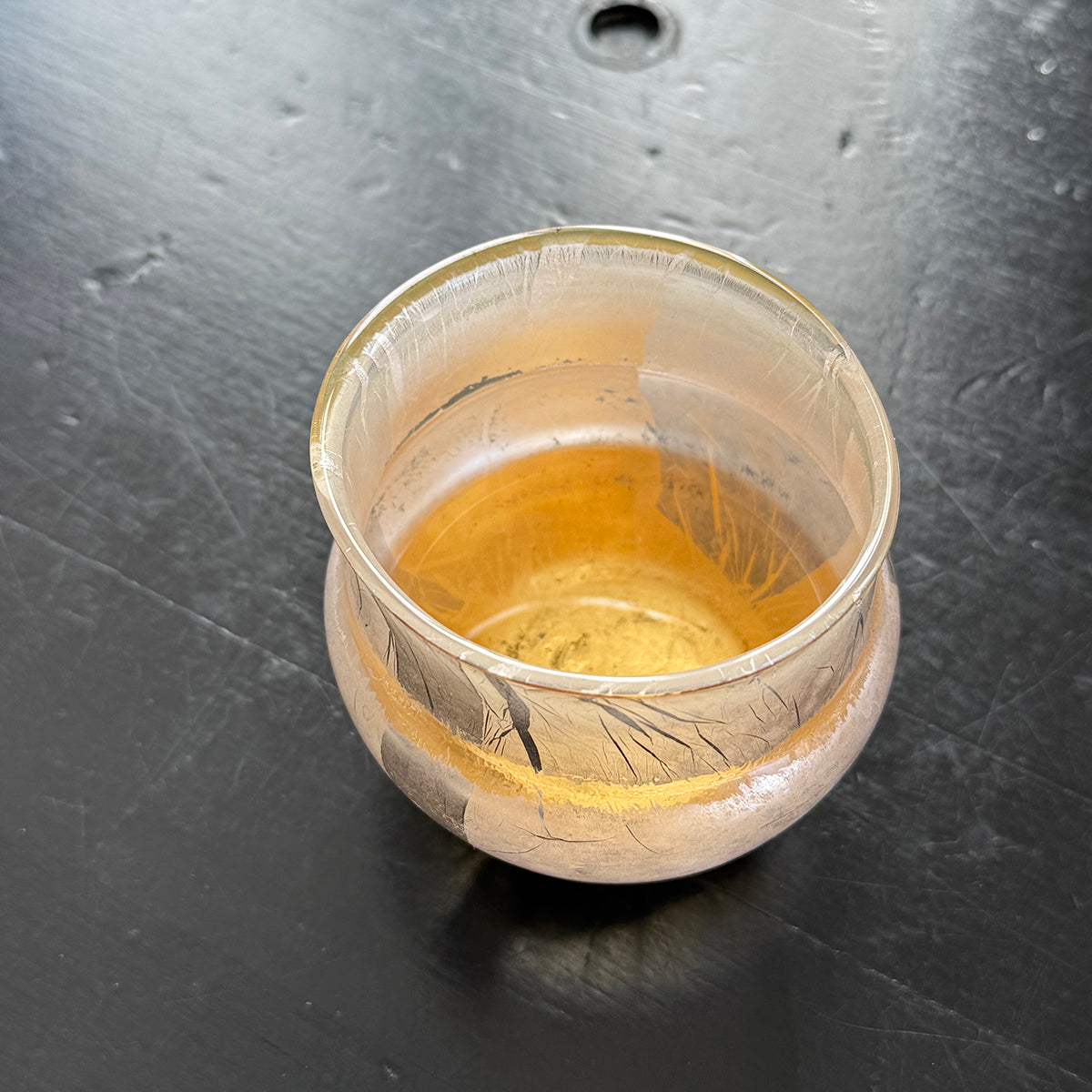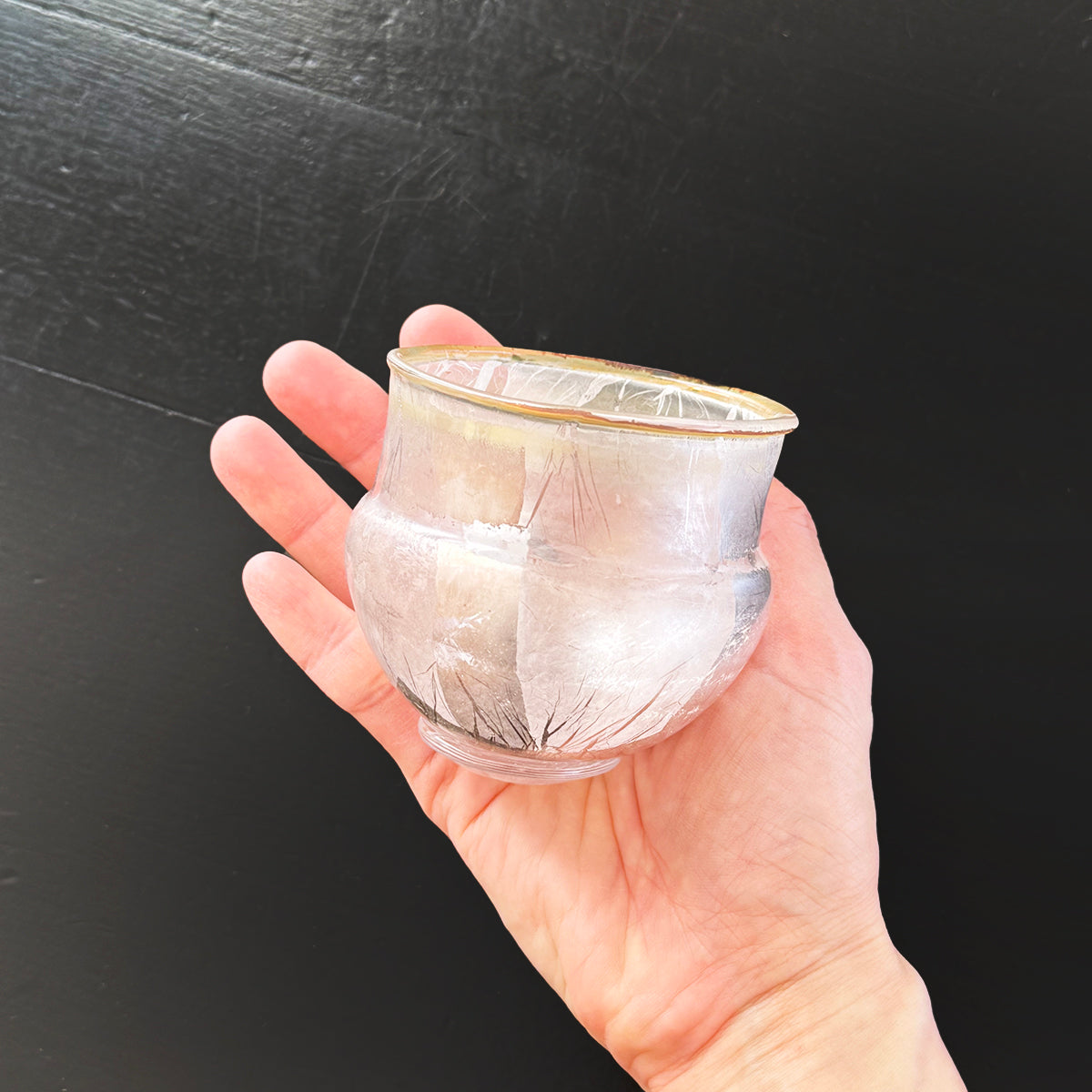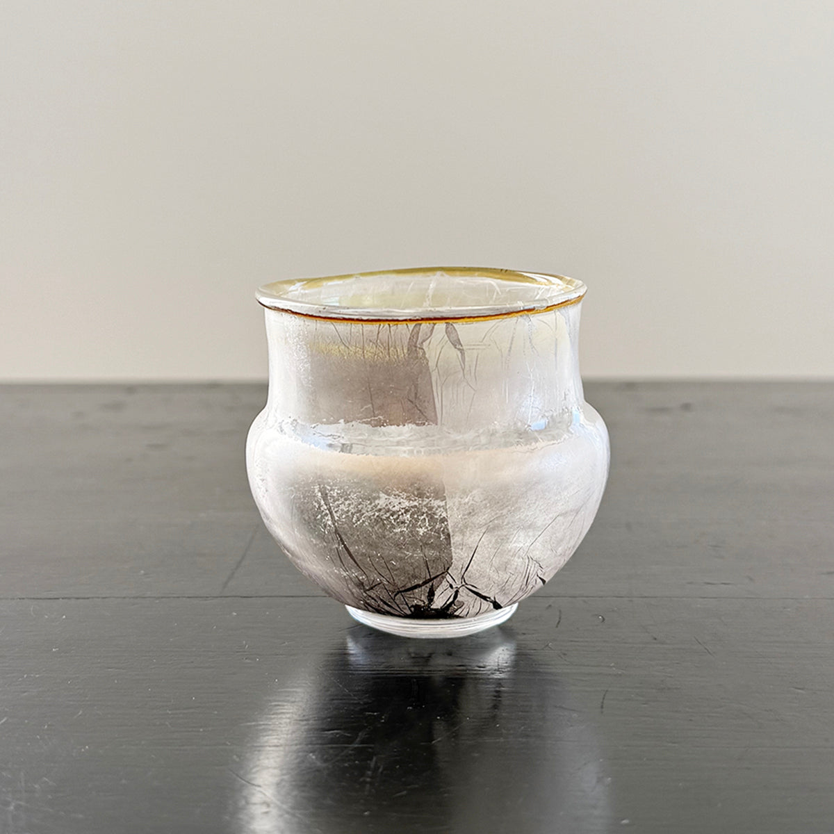 A hand-blown glass vessel made of soda-lime glass and silver foil.
