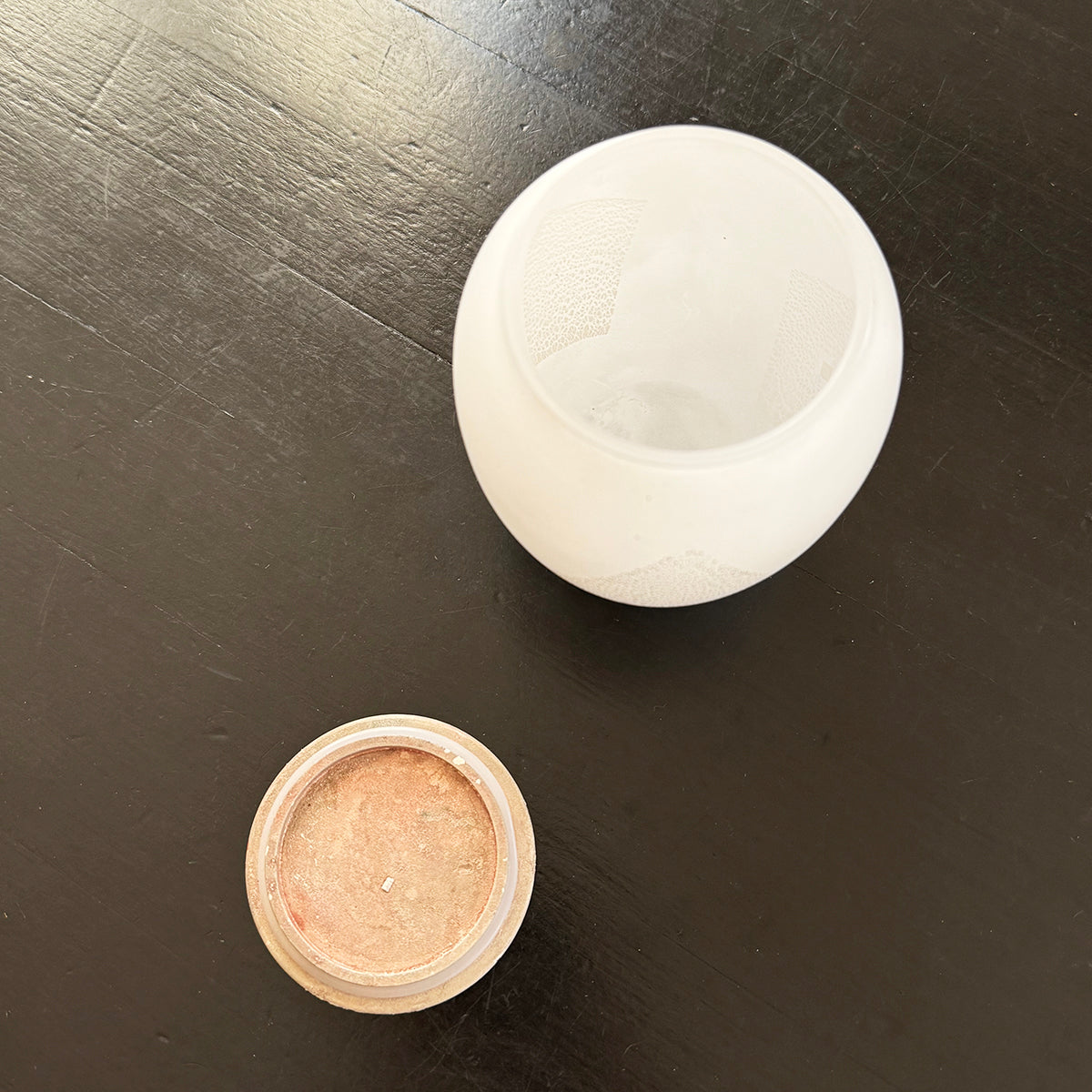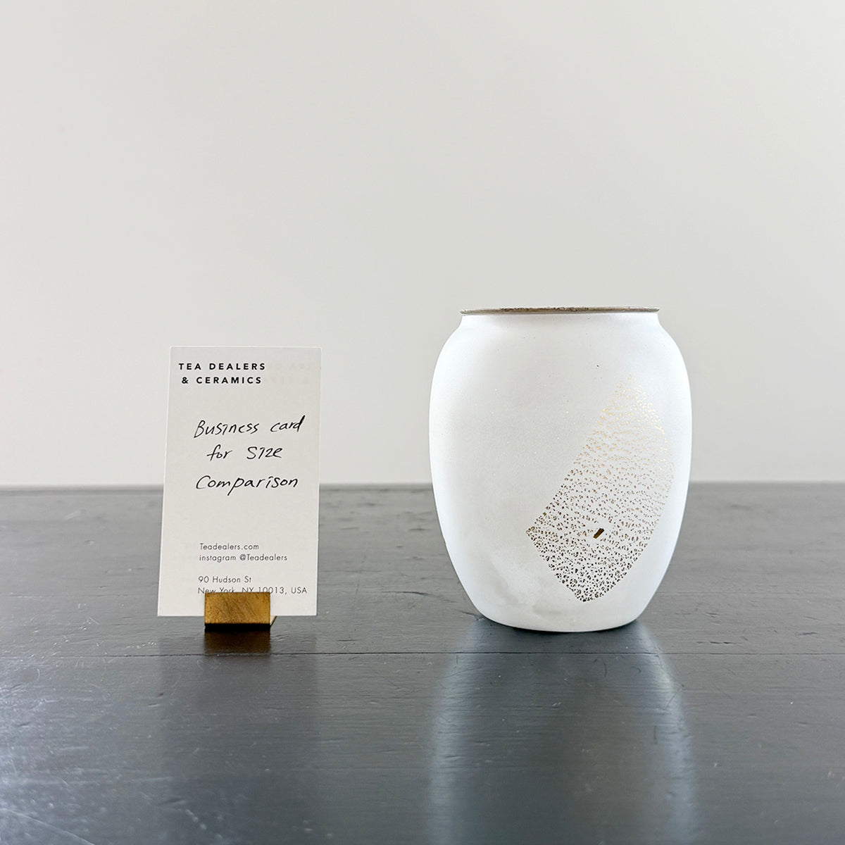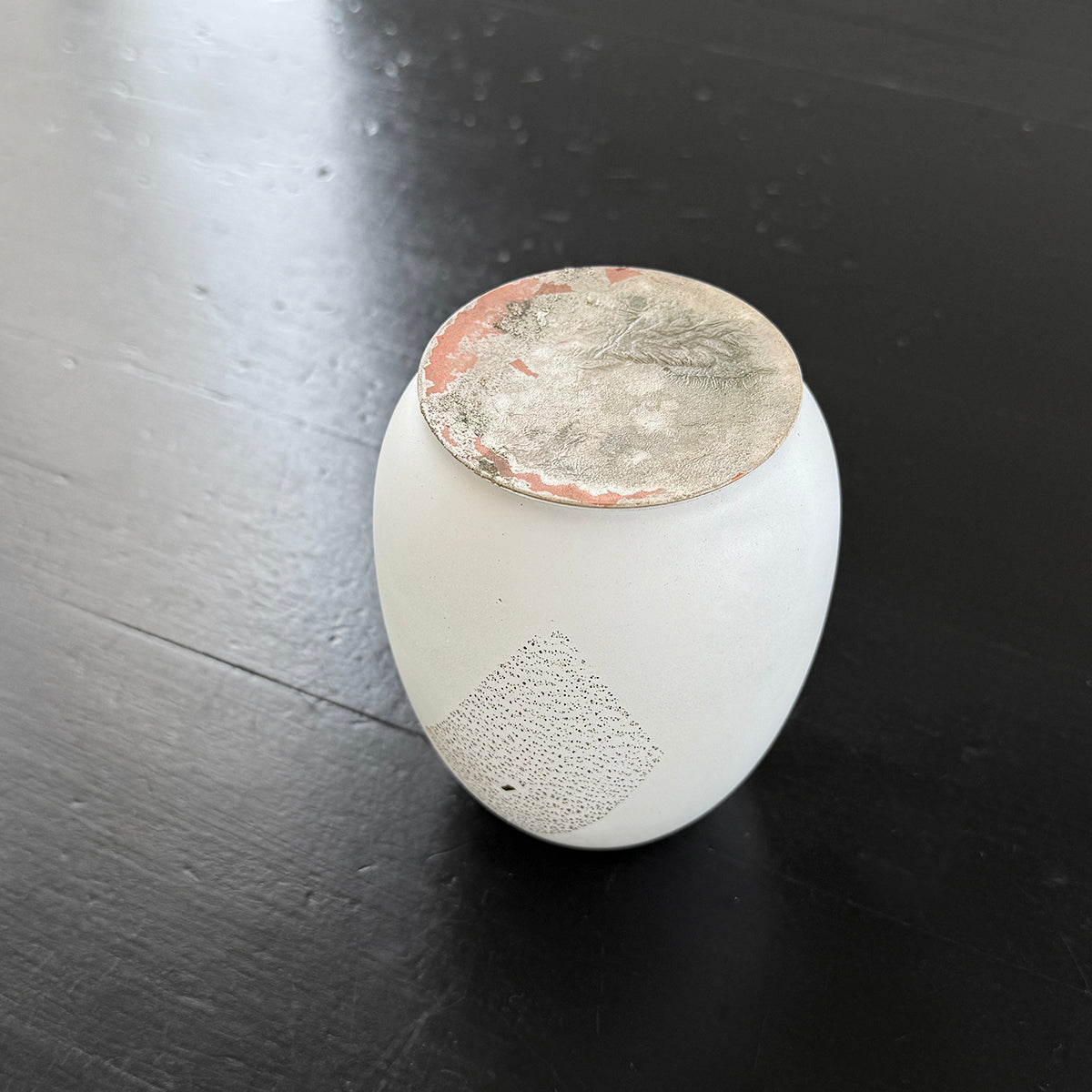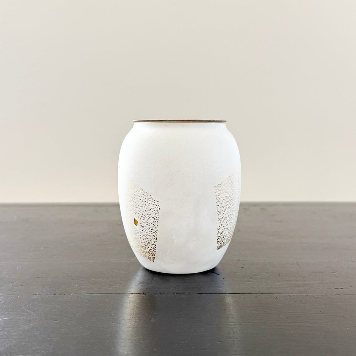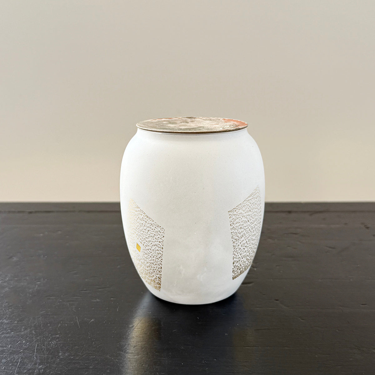 A large classic-shaped, hand-blown glass canister for storing tea, made of soda-lime glass, gold foil, and a copper lid.